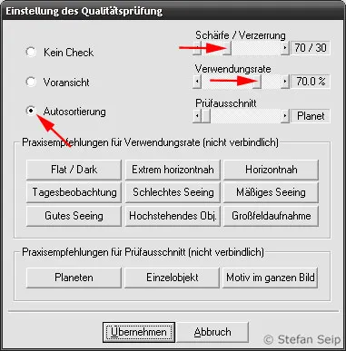 Según la naturaleza del vídeo en cuestión, puede ser necesario modificar estos valores. Si los vídeos grabados en aire turbulento contienen sólo unas pocas imágenes individuales nítidas, la tasa de utilización deberá reducirse drásticamente. Si el aire turbulento también causó muchas imágenes planetarias distorsionadas, se debería dar más prioridad a la distorsión y menos a la nitidez. Los controles deslizantes se desplazan a las posiciones definidas y sugeridas al hacer clic en los botones situados debajo de las "Recomendaciones prácticas" indicadas en el cuadro de diálogo.