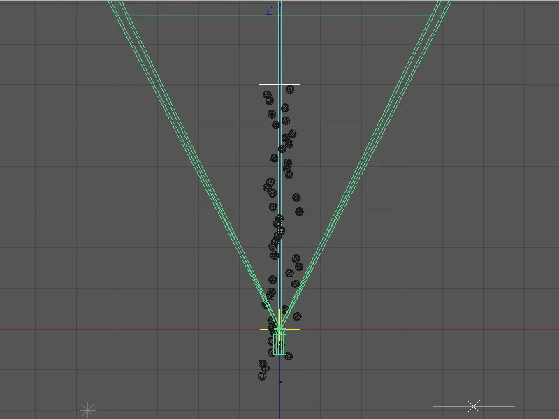 Ahora queremos capturar esta pequeña animación de partículas con una cámara 3D estereoscópica para poder renderizar una animación estereoscópica a partir de ella. Para capturar el efecto 3D más fuerte posible, dejamos que las partículas fluyan hacia nosotros de frente.