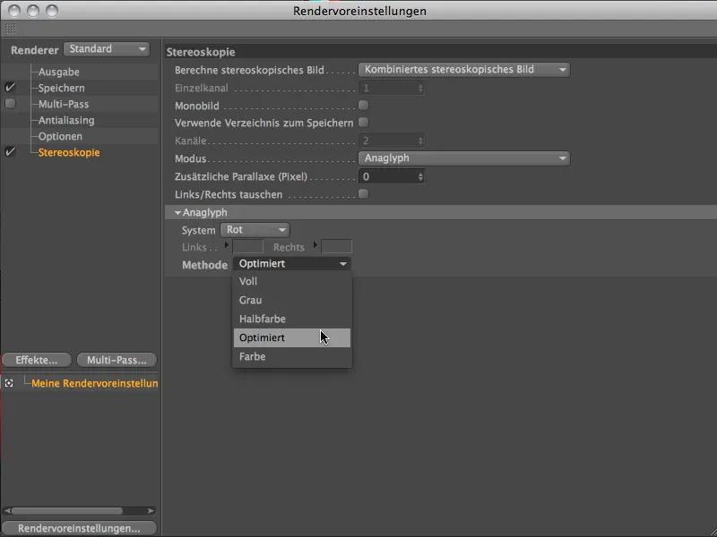 En la entrada Modo, seleccionamos el método de estereoscopía deseado. Para nuestras gafas rojo-cian, necesitamos el modo Anaglifo.