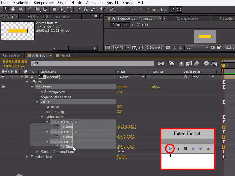 Si ahora abrimos Efectos>Marioneta>Malla>Deformar, vemos los 3 pines. Con un clic derecho me gustaría separar las dimensiones - que por desgracia no funciona aquí. Así que no tenemos ninguna posibilidad de trabajar con curvas utilizando la herramienta Marioneta. Tampoco tenemos forma de subordinarlas entre sí. Por eso siempre es un fastidio animar con la Herramienta Marioneta.