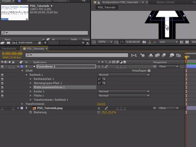 Empecemos por construir un puntero de ratón en After Effects. Para ello, primero me aseguro de que no hay ninguna capa seleccionada y creo un rectángulo blanco con la herramienta de forma.