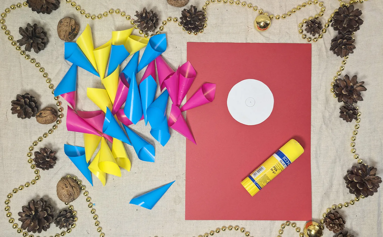 Võta värviline kartong DIN A4 formaadis. Sellele tuleb paigutada umbes 10 cm läbimõõduga ring. Lõika teisest paberist see ring välja ning kleebi hoolikalt keskele kartongi. See ring saab olema alus, millele rullikesed kinnitatakse ja mis annab lillele 3D-efekti.