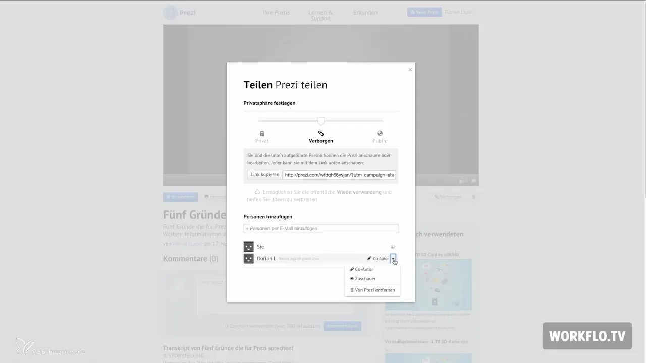 On võimalik töötada koos kuni 10 inimesega samal ajal Prezi esitlusel. Nende kutsumiseks mine tagasi jagamise nupule ja sisesta osaliste e-posti aadressid. Siin on oluline, et kutsutud isikud oleksid määratud toimetajaks, et nad saaksid muudatusi teha.