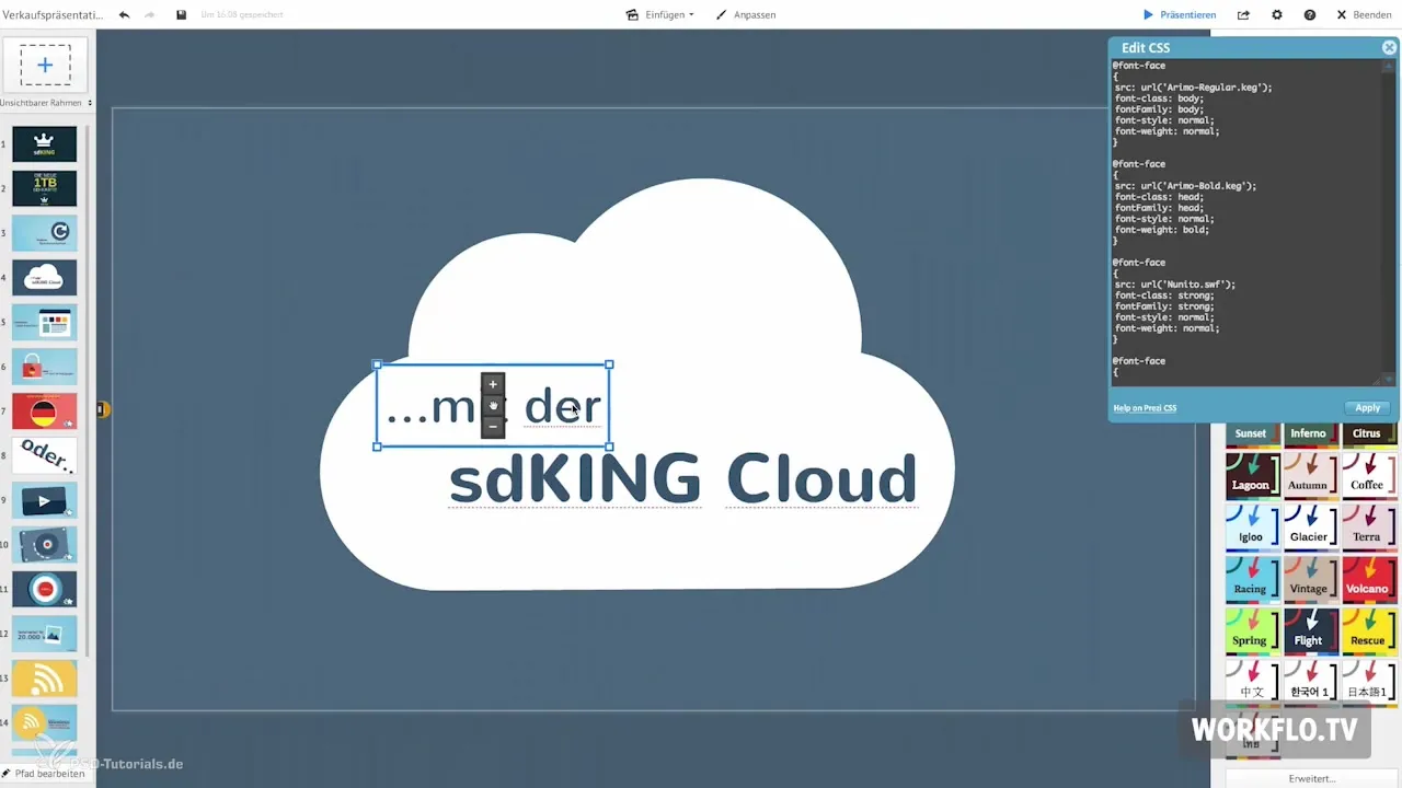 Kui soovid oma esituses kasutada erinevaid fonte, soovitan veebisaiti prezmaven.com. Sealt saad minna "Teenuste näpunäidete ja toimingute" alla ja valida vahekaart "fontide lisamine". Olen valinud fondi "Nunito". Olen selle lisanud oma esitusele, minnes CSS-redaktorisse ja kohandades fondi pealkirjade, teksti ja alampealkirjade jaoks.