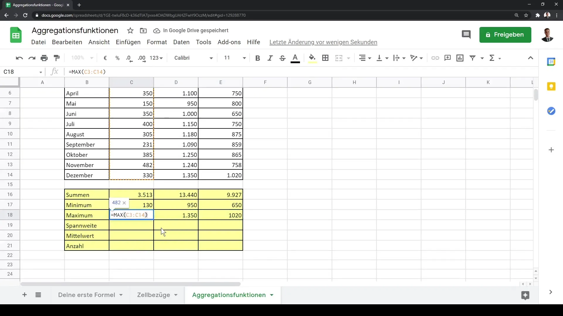 Analoogselt MIN-funktsiooniga vaatame nüüd MAX-funktsiooni. Selle funktsiooniga saate määrata maksimumväärtuse - näiteks kuu kõrgeima käibe või kasumi. Kasutage valemit =MAX() ja valige vajalik ala. Lohistage valem samuti paremale.