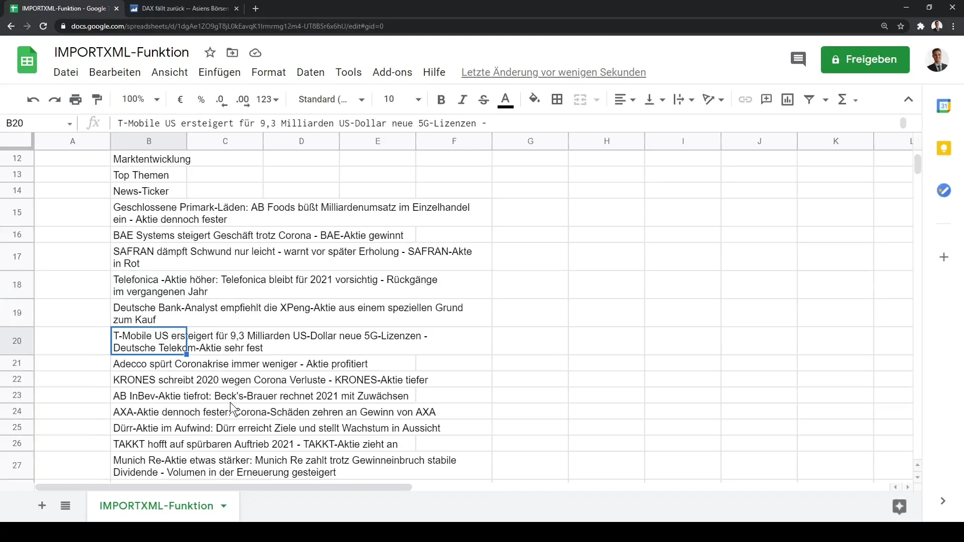 Kui järgid kõiki neid samme, näed finanzen.net lehelt kõige uuemaid ettevõtte teadaandeid ja aktsiahindu otse oma Google Sheetis. Saad neid andmeid seejärel kasutada analüüside tegemiseks või aruannete koostamiseks.