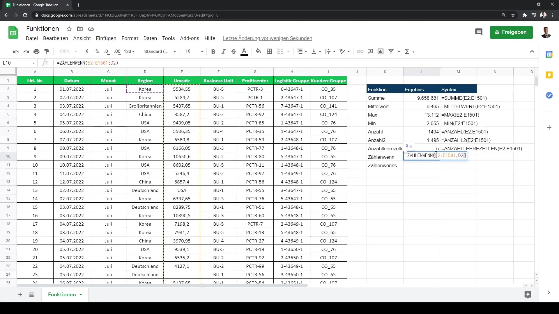 Eeldame, et soovite kindlas piirkonnas, näiteks Koreas, müüginumbreid teada saada. Funktsiooniga valite kogu vahemiku ja määratlete seejärel oma kriteeriumi.