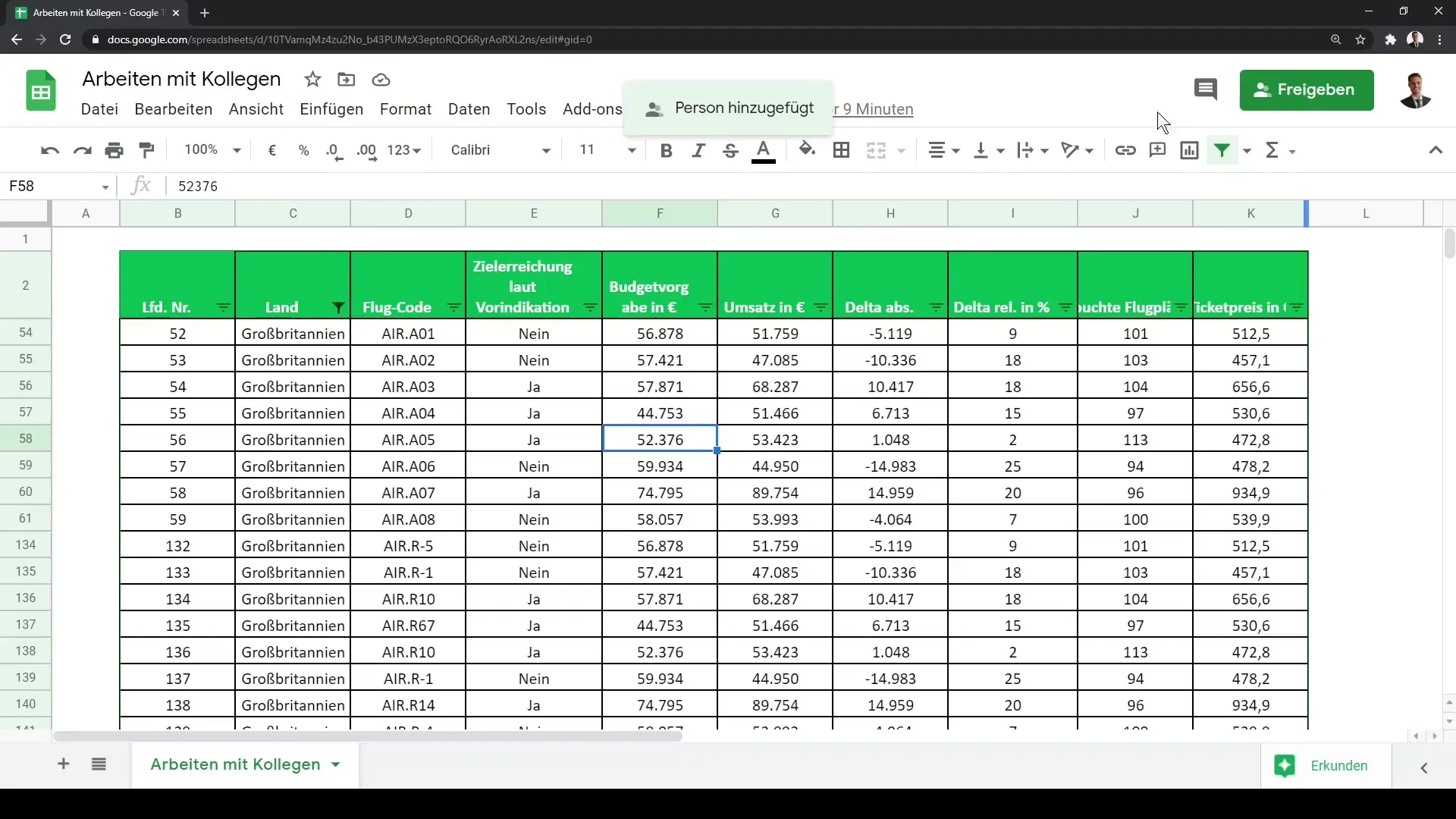 Näiteks näete enda kohta sinises lahtris F58, samal ajal kui Tobias töötab lahtris B2. Kui ta lahtrit vahetab, näete seda kohe ka teie.