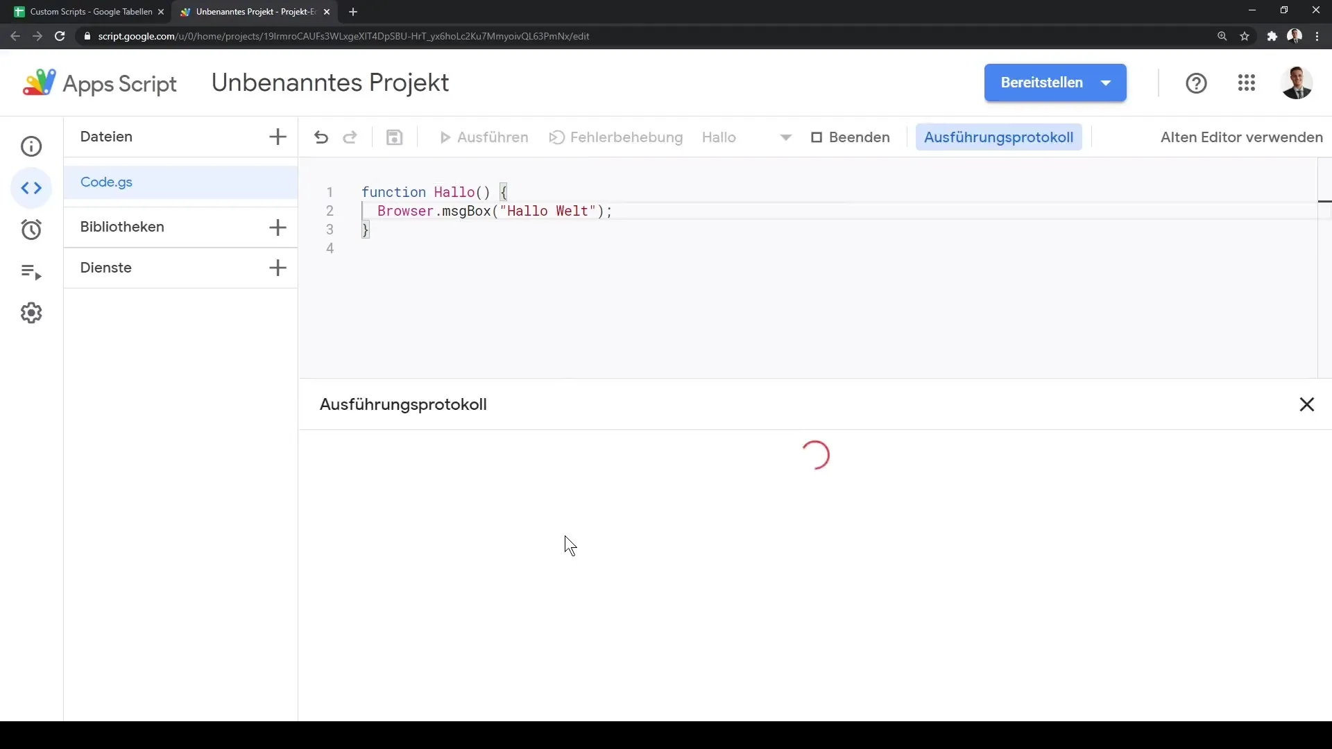 Skriptiredaktor avaneb uues aknas ja näitab teile keskkonda, kus saate oma projekti alustada. See tööriist on nimega Apps Script ja moodustab aluse meie kodeerimisele Google Sheets'is. Siin saate programmeerida oma funktsioone JavaScriptis.