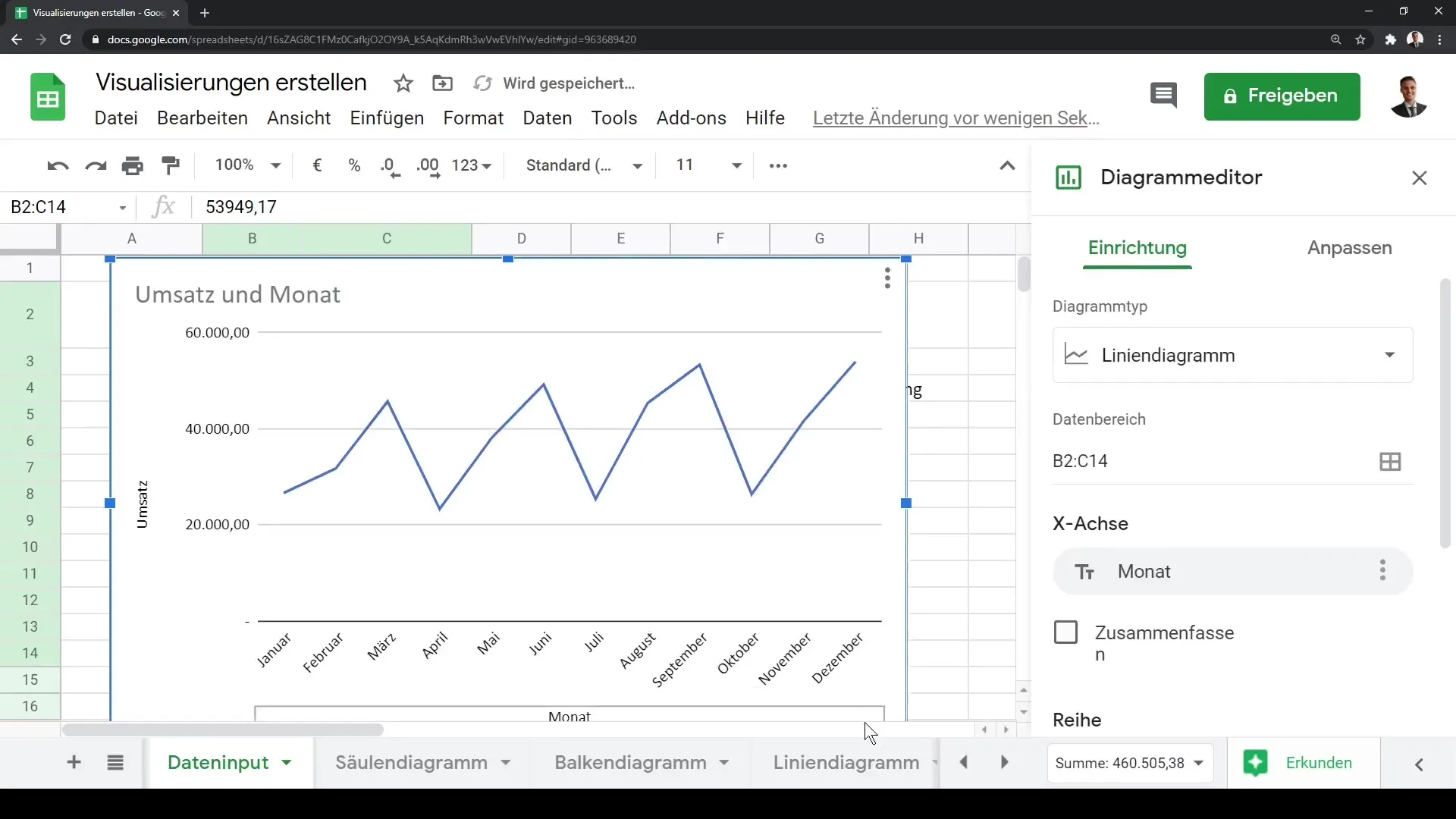 Teine võimalus diagrammi loomiseks on lihtsalt klõpsata tööriistaribal oleval „Lisa diagramm“ sümbolil. Ka siin genereeritakse otse teie esimene visualiseering.