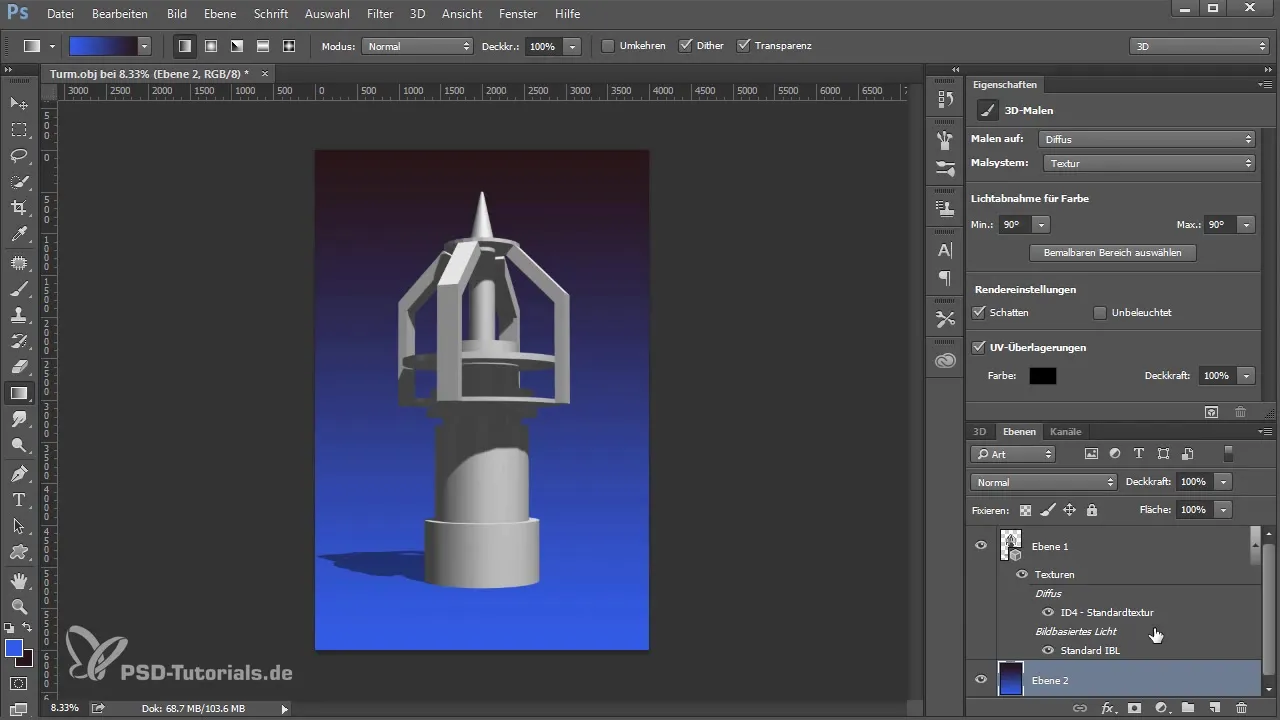 Siirry 3D-tilaan ja tee perussäätöjä mallillesi. Aseta 3D-tornisi ja käännä se niin, että syntyy mielenkiintoisia varjoja. Nämä asetukset ovat tärkeitä, jotta lopullinen kuva näyttää realistisemmalta.