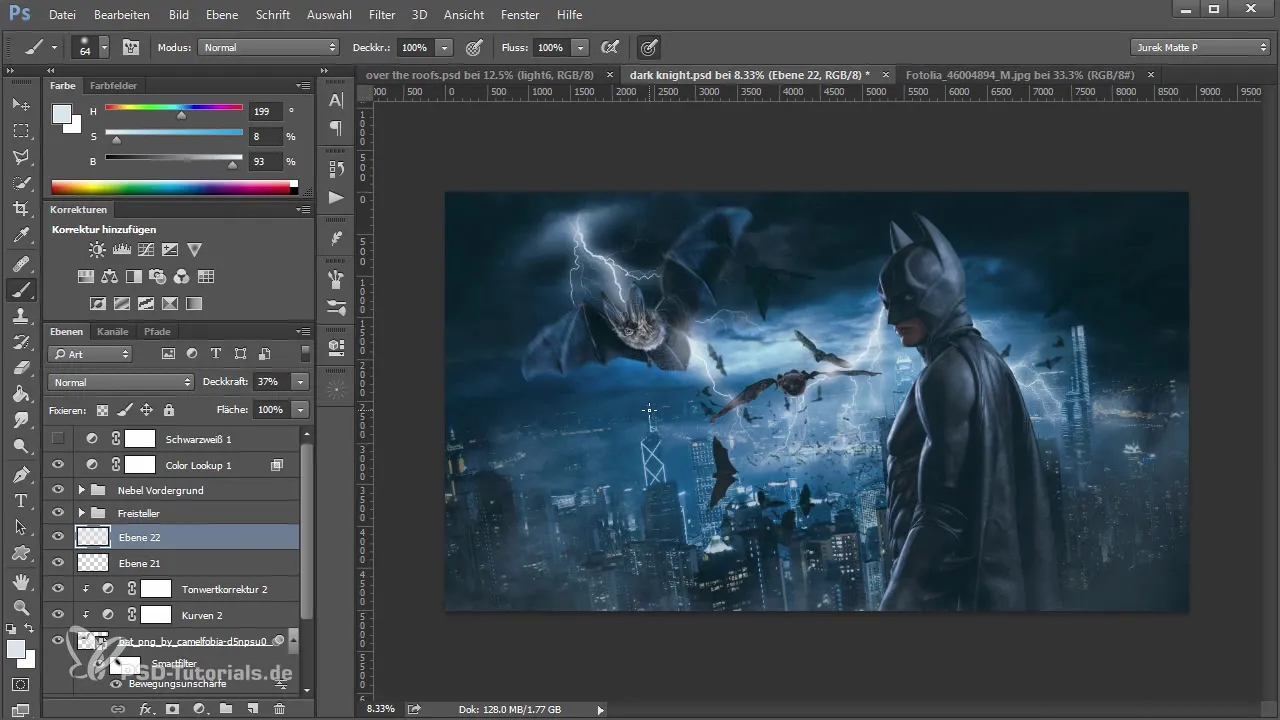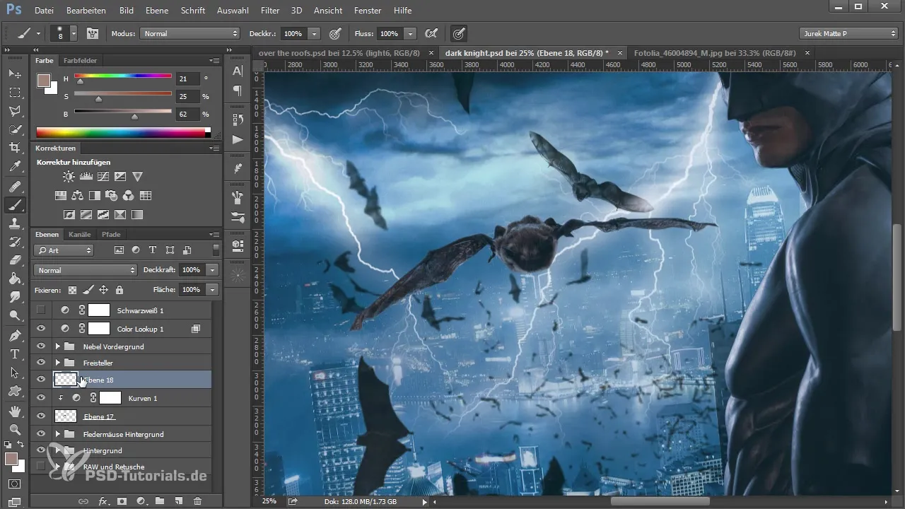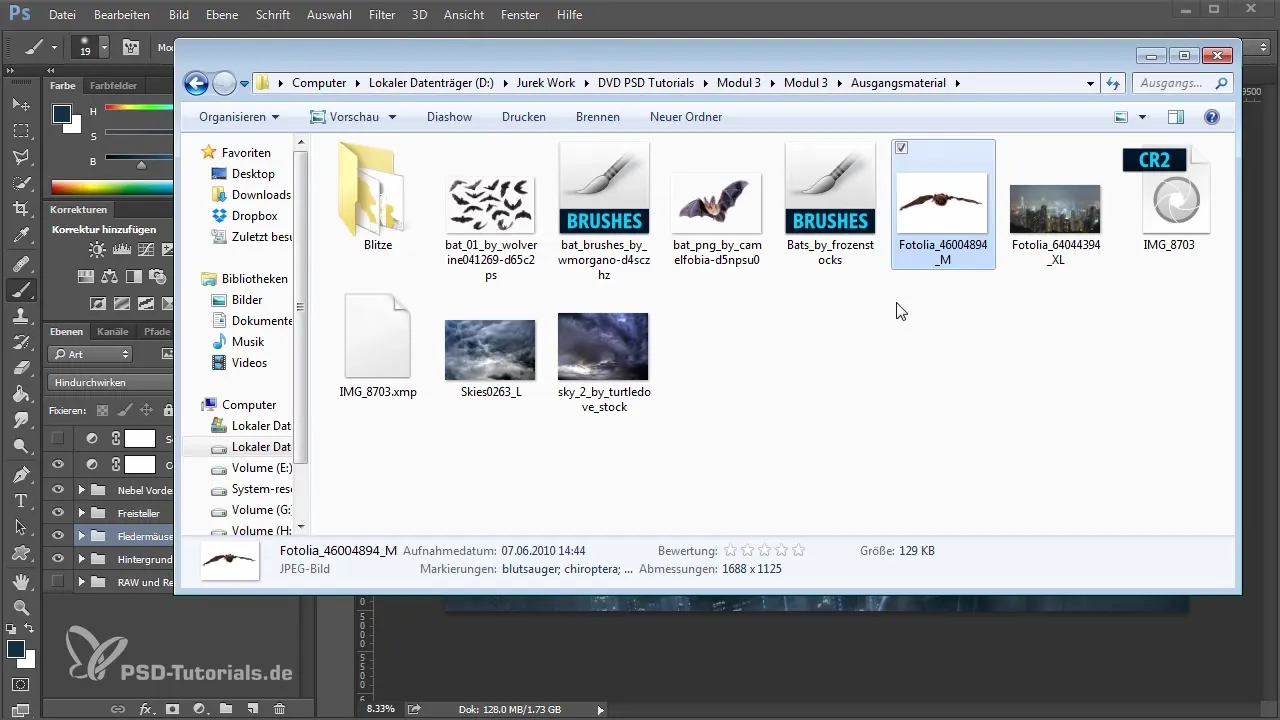 Aluksi olet luonut kuvan peruselementit ja asettanut muutaman lepakon taustalle. Nyt keskitymme kuvan keskellä oleviin lepakoihin. Olet jo valinnut muutamia stock-kuvia, joten olet valmis muokkaamaan niitä.