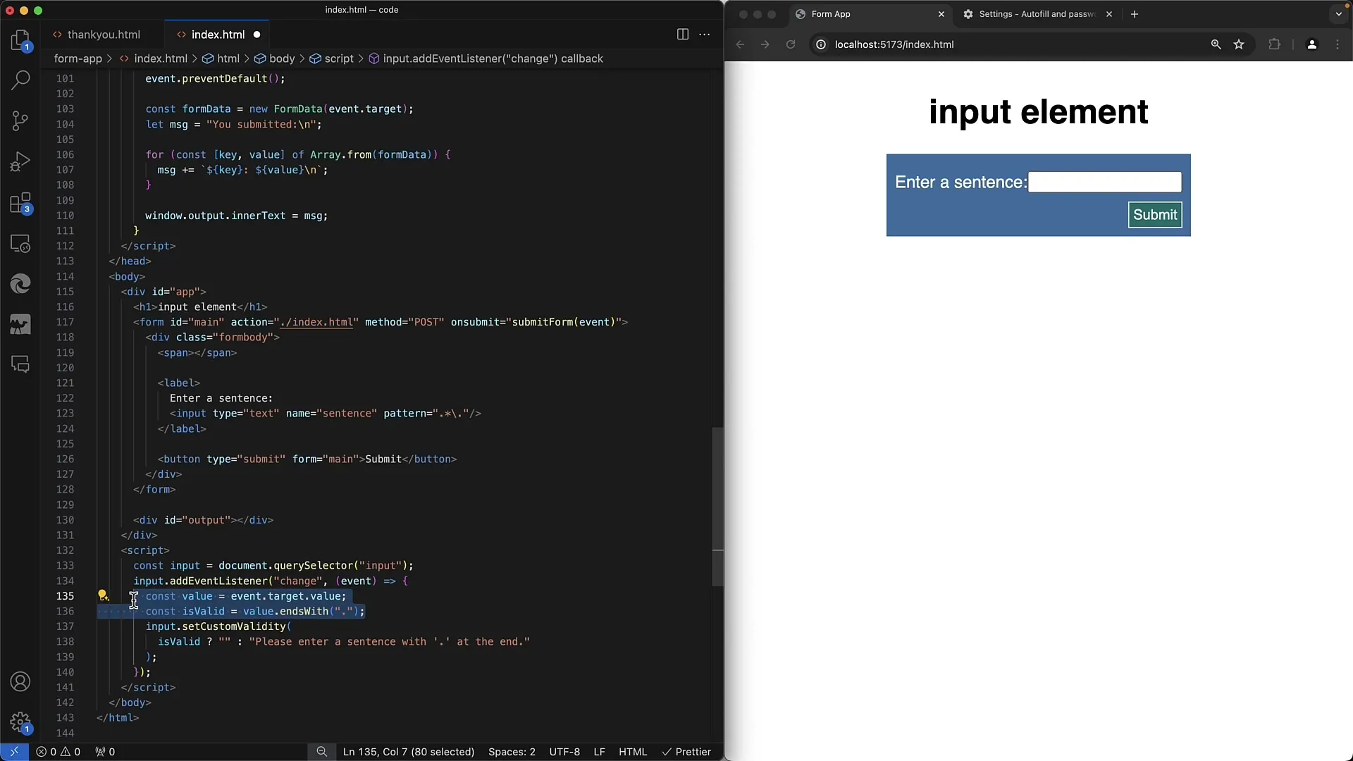 JavaScript-koodissa tarkista, päättyykö annettu arvo todella pisteeseen. Käytä setCustomValidity-metodia näyttääksesi mukautetut virhesanomat. Jos lause ei ole kelvollinen, anna vastaava palaute.