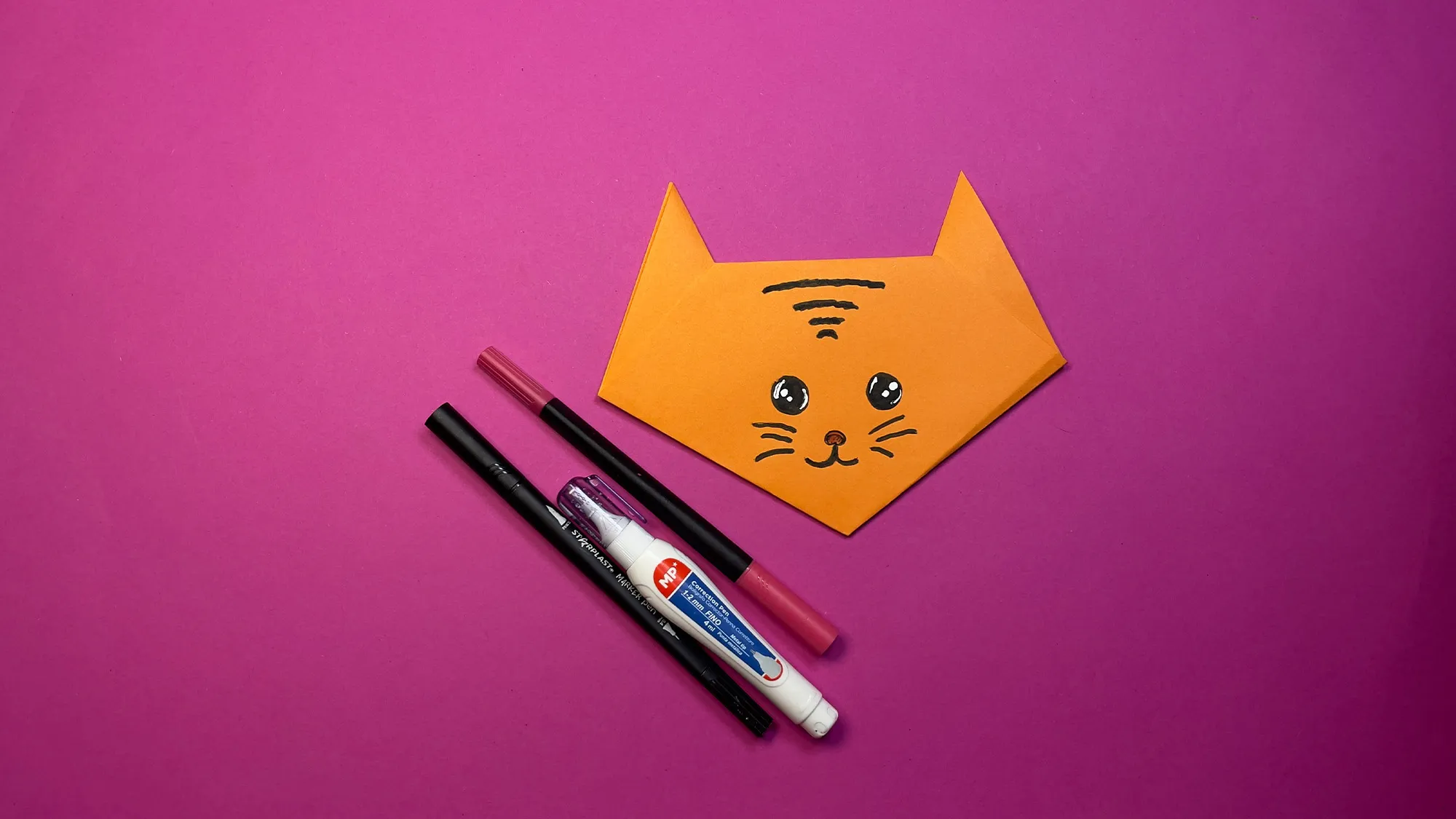 Prenez maintenant des feutres et dessine une nez, des yeux et une bouche au chat. Tu peux également ajouter des moustaches si tu le souhaites. Laisse libre cours à ta créativité - chaque chat est unique ! Et voilà, tu as fini ton chat en origami !
