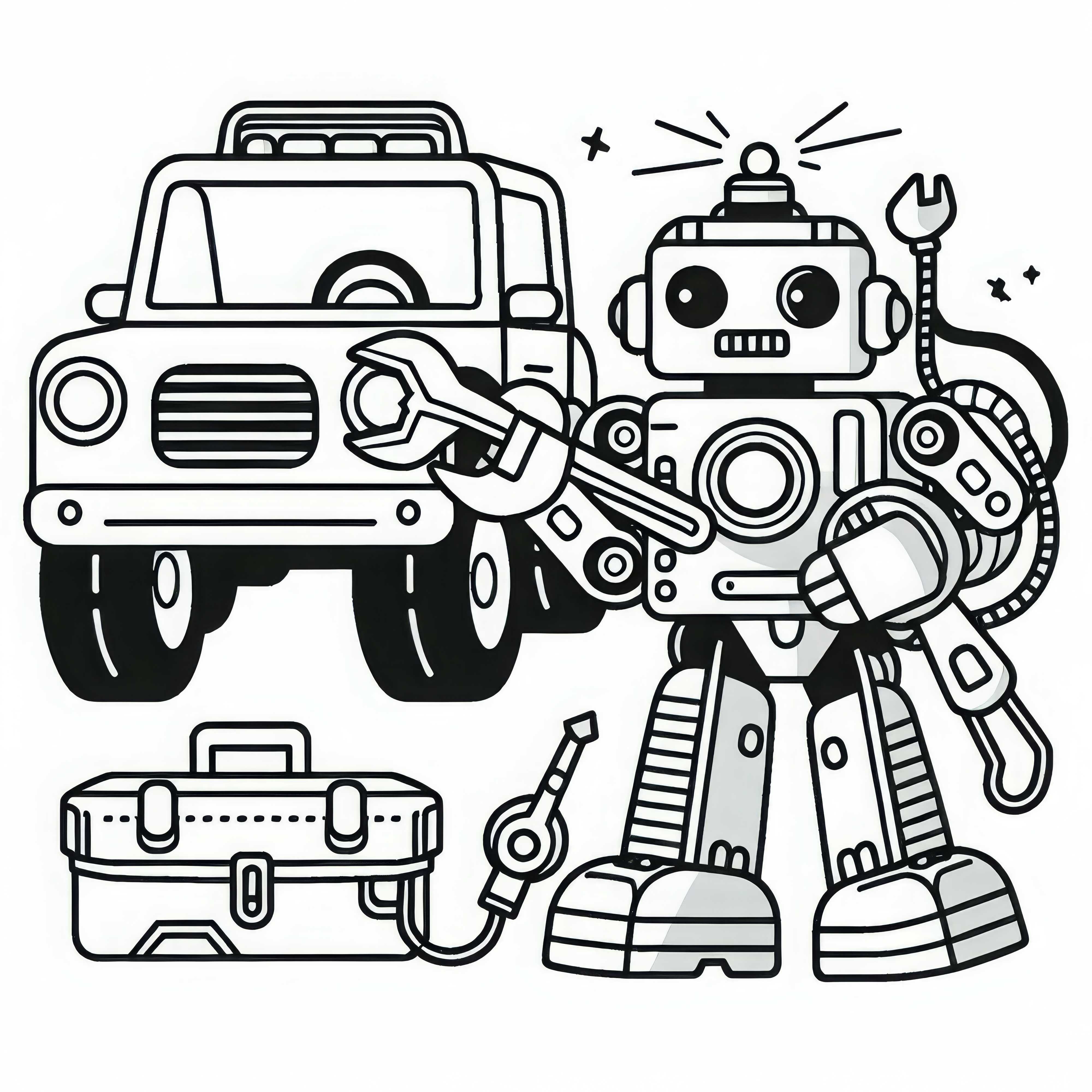 Robot avec bras de outils répare un véhicule - Dessin à colorier gratuit pour les garçons à partir de six ans
