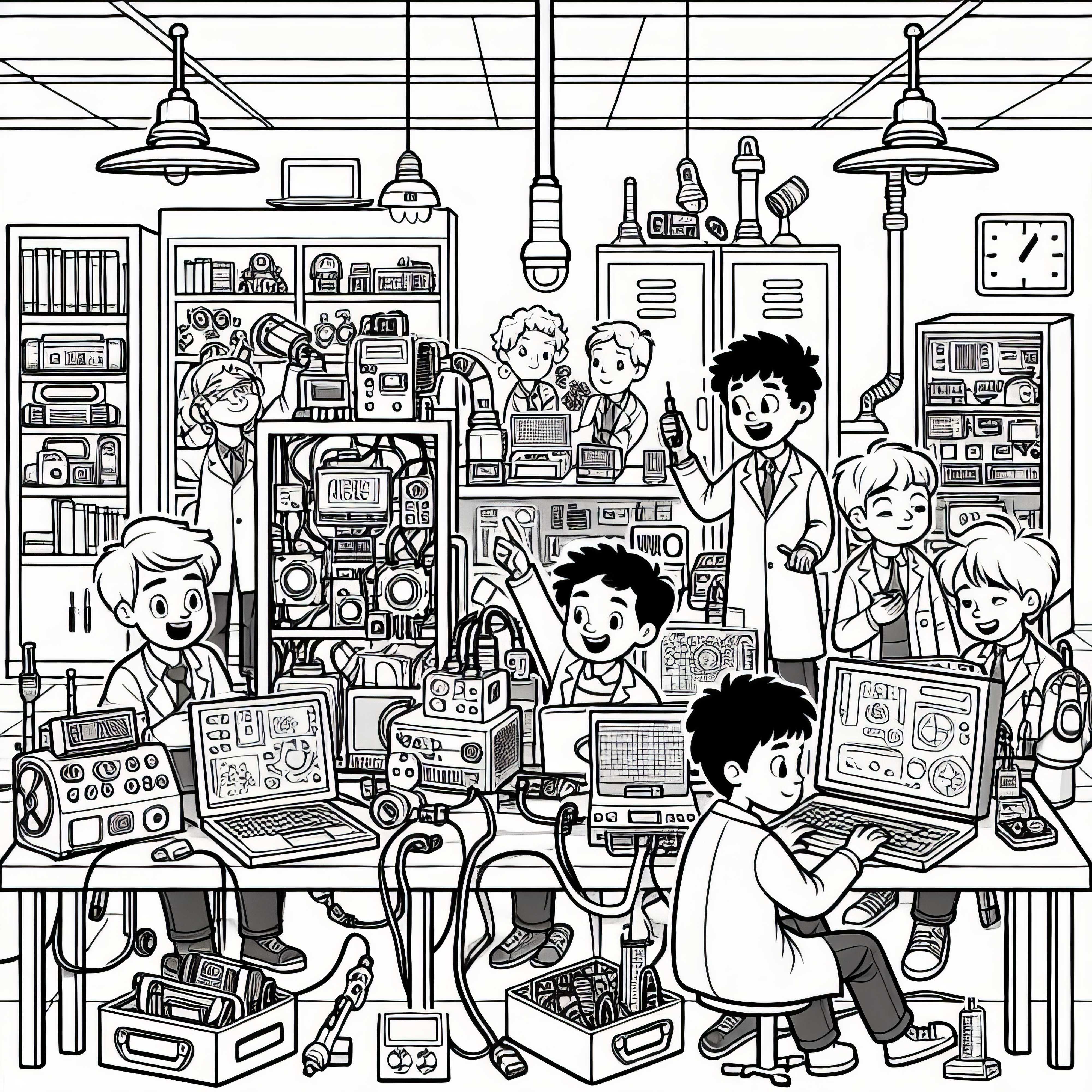 Laboratoire technique avec des appareils et des enfants en tant que chercheurs - Modèle de coloriage pour garçons à partir de neuf ans
