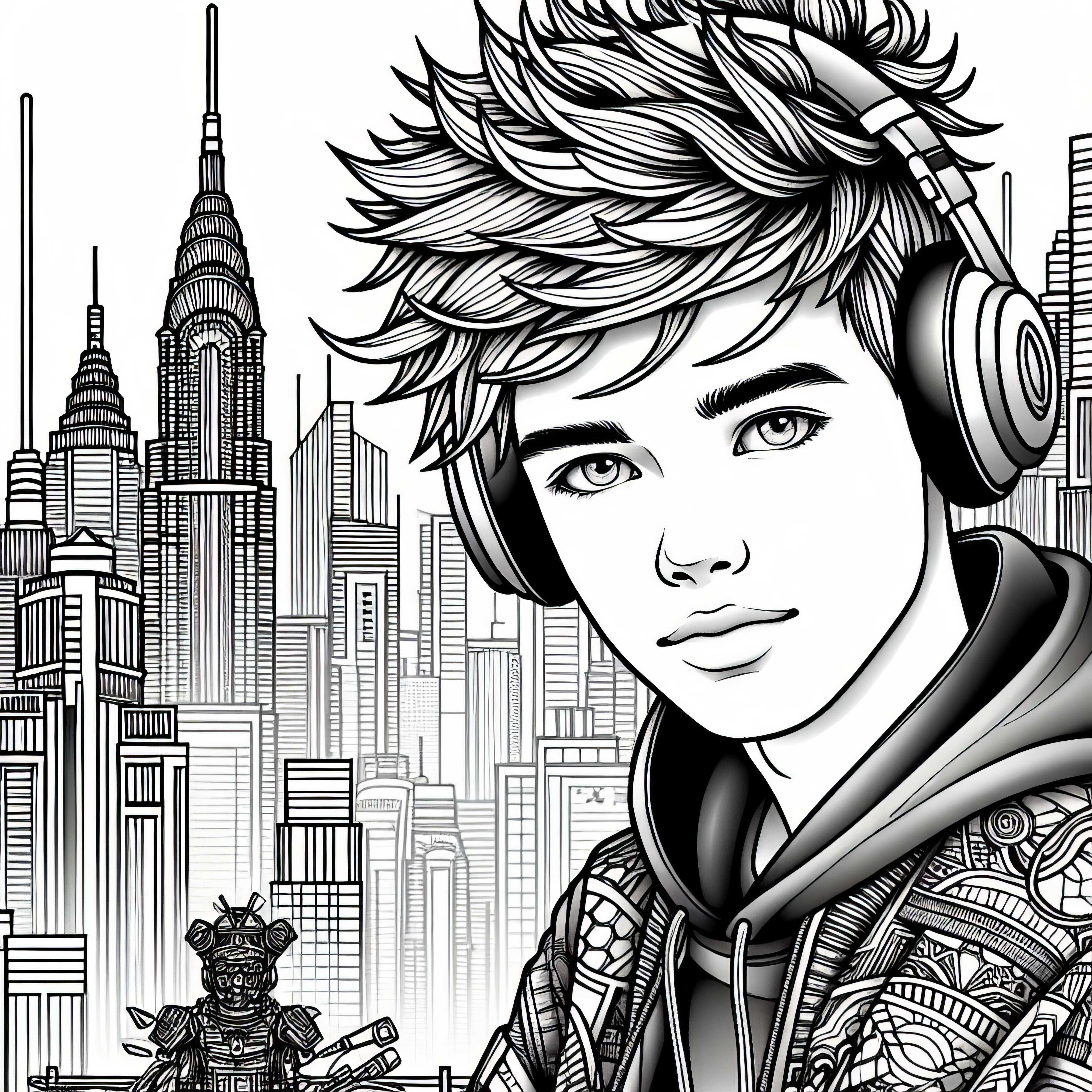 Garçon avec écouteurs, ville en arrière-plan - Image à colorier pour les garçons à partir de douze ans gratuite