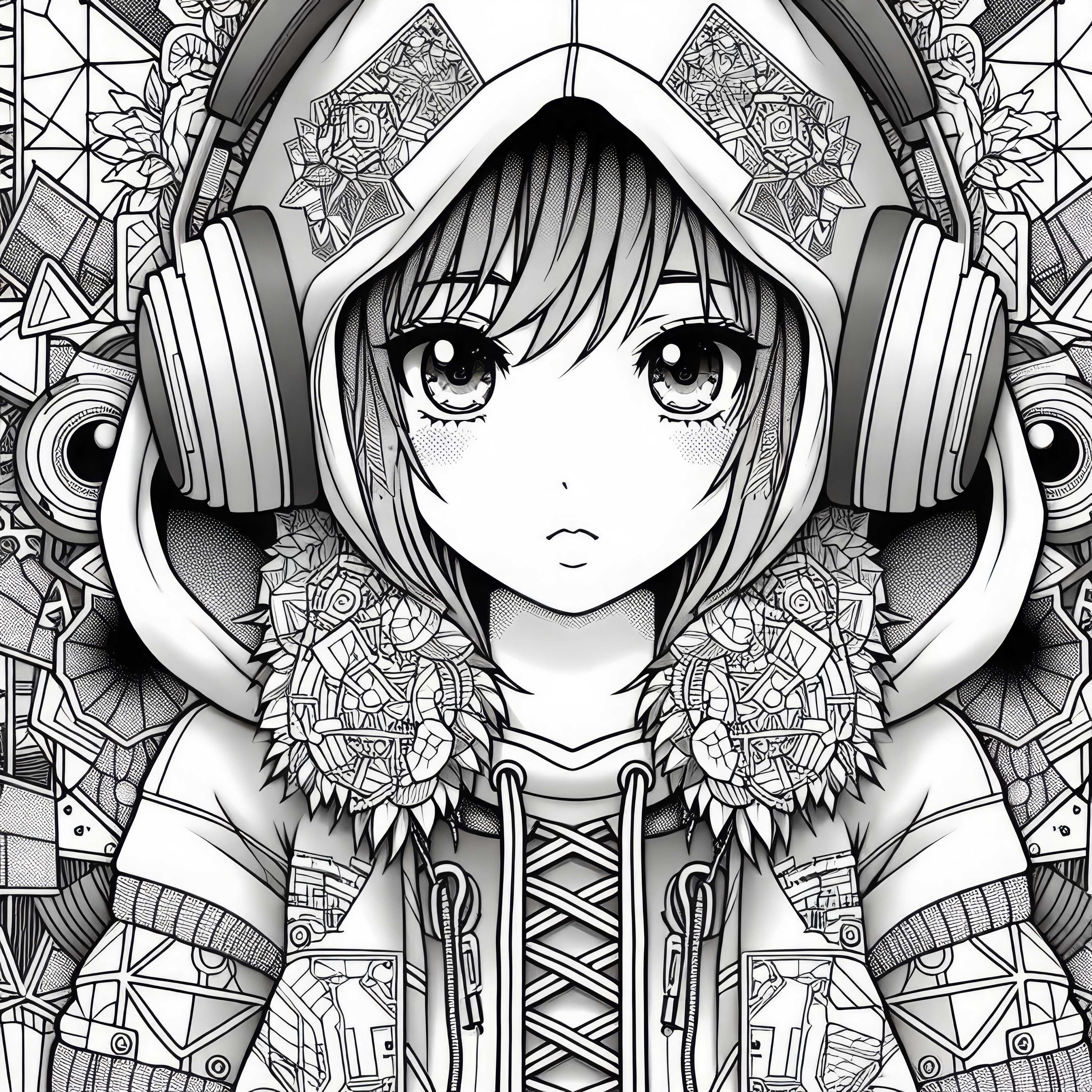 Fille manga avec des écouteurs dans un hoodie oversize – Image à colorier pour les filles à partir de douze ans (gratuit)