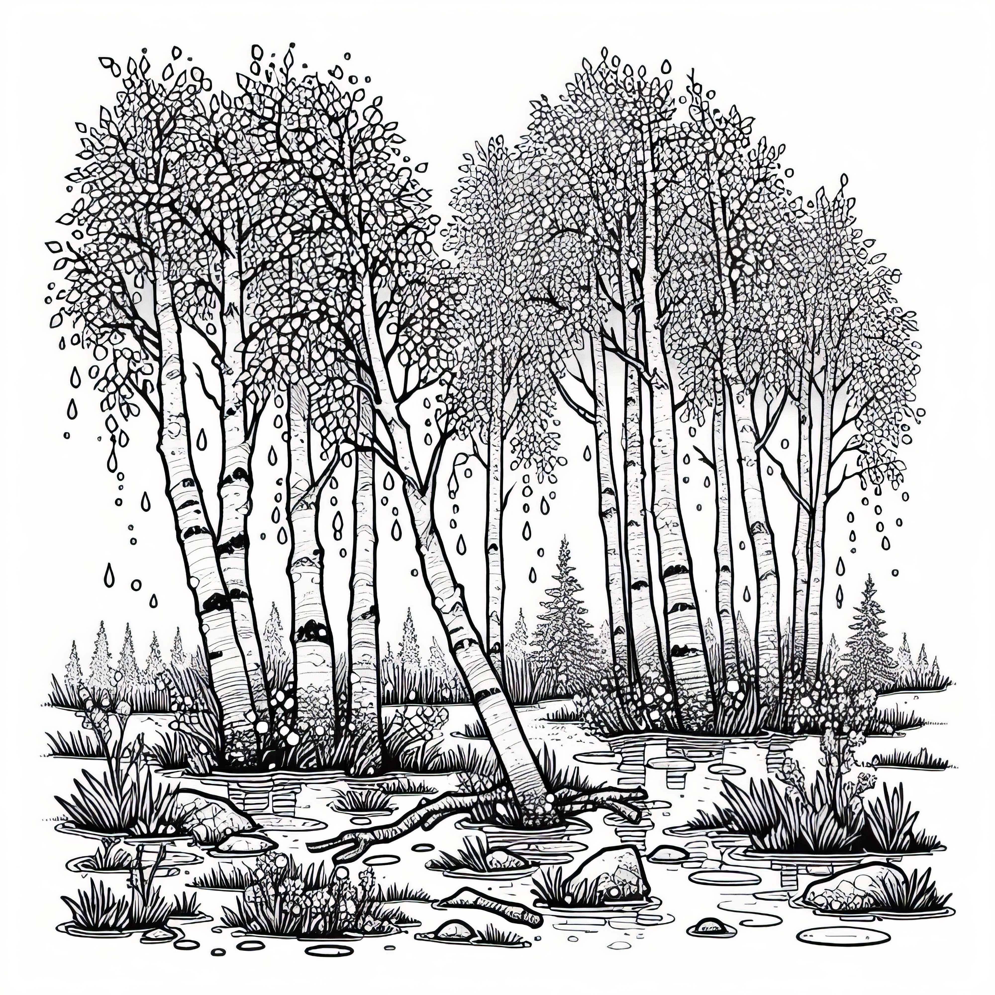 Plusieurs peupliers trembleurs sur un sol humide – Image à colorier gratuite