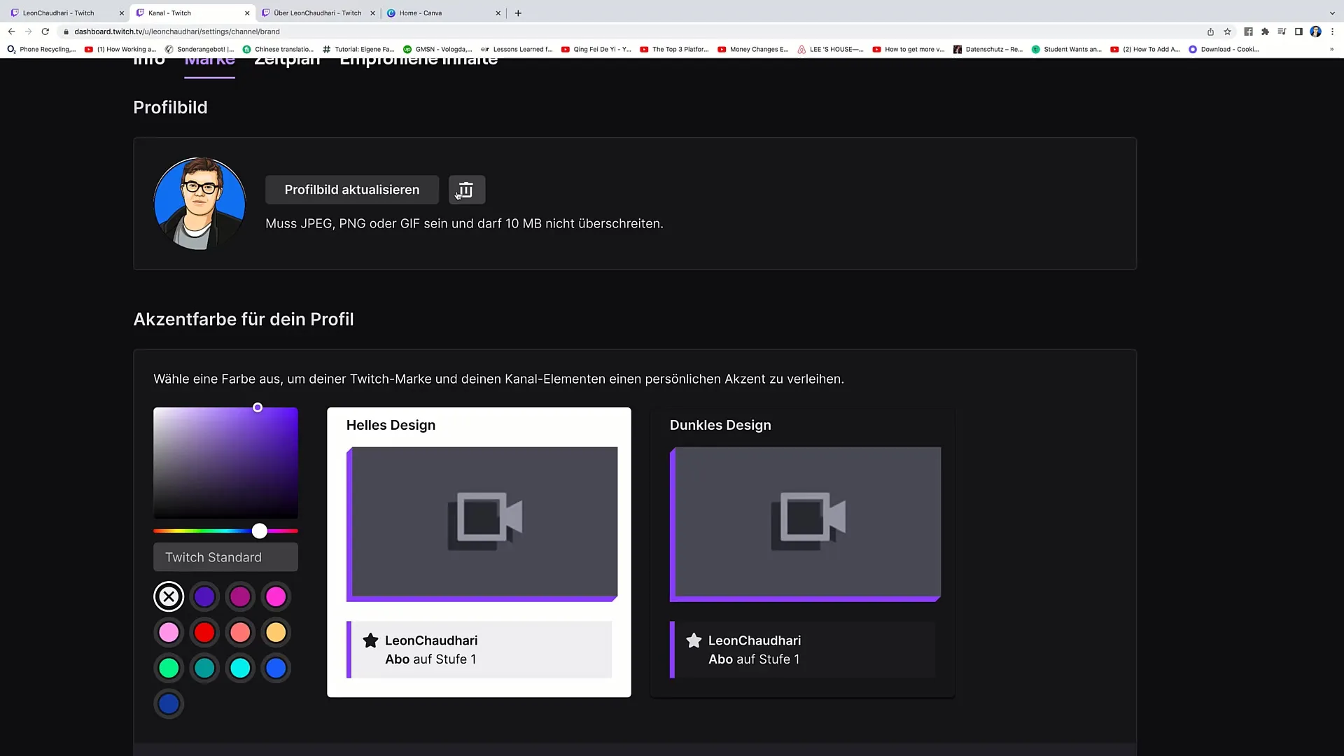 Vous avez également la possibilité de choisir un arrière-plan pour votre profil. Vous pouvez choisir un arrière-plan standard de Twitch ou télécharger le vôtre. Si vous souhaitez créer votre propre arrière-plan, vous pouvez utiliser la plateforme Canva.