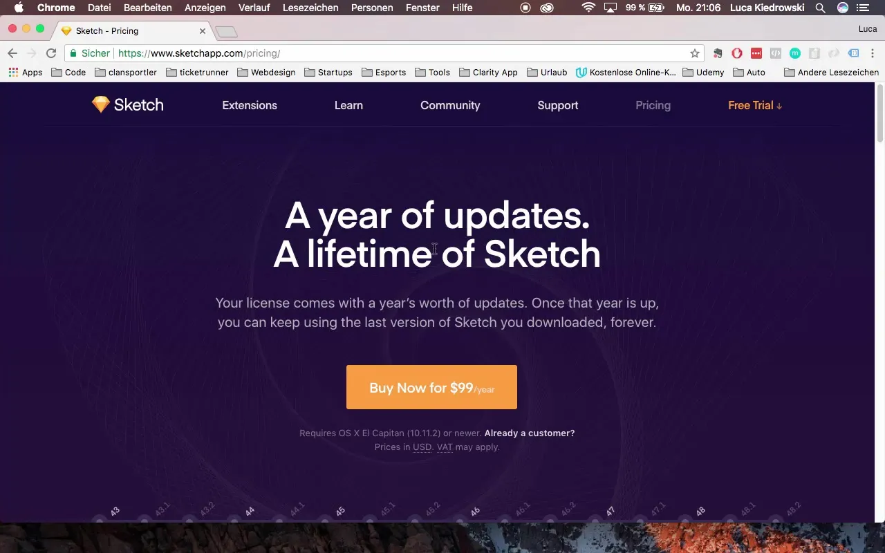 Sur le site, tu trouveras également la possibilité de télécharger Sketch. Il existe une version d'essai valable pendant 30 jours. Alternativement, tu peux acheter une licence pour 99 dollars par an.