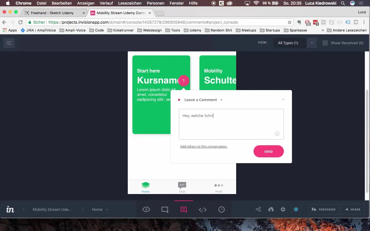 Utilisez la fonction de commentaire et de feedback dans InVision pour clarifier des questions générales sur vos designs. Vous pouvez ajouter un commentaire directement dans le prototype, qui pourra ensuite être répondu par d'autres membres de l'équipe. Cela est particulièrement utile pour s'assurer que votre design respecte le briefing et que toutes les attentes sont satisfaites.