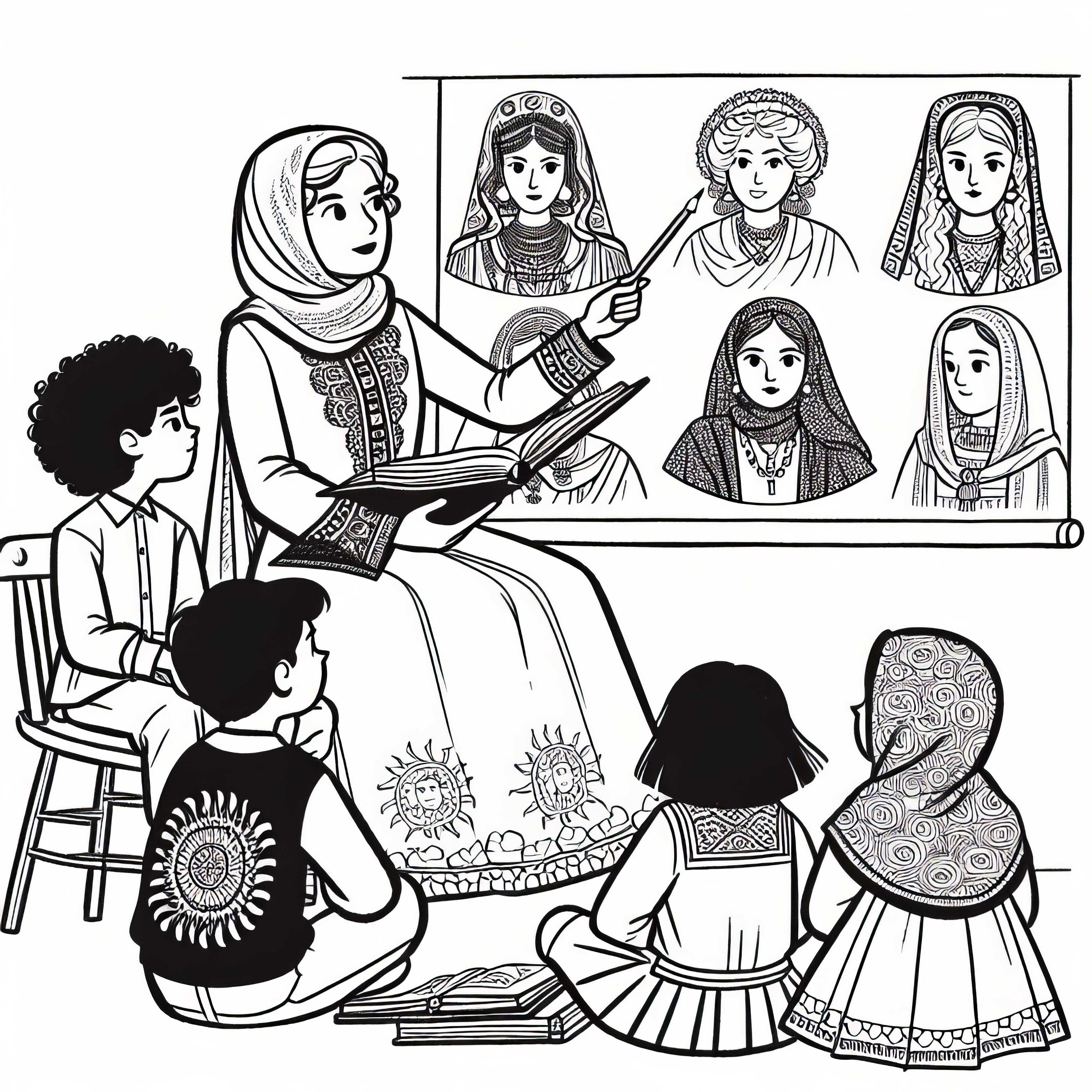Felhúzva hallgatják, ahogy a tanárnő a történelem nagy nőiről mesél – Történelmi női figurák színezőképe