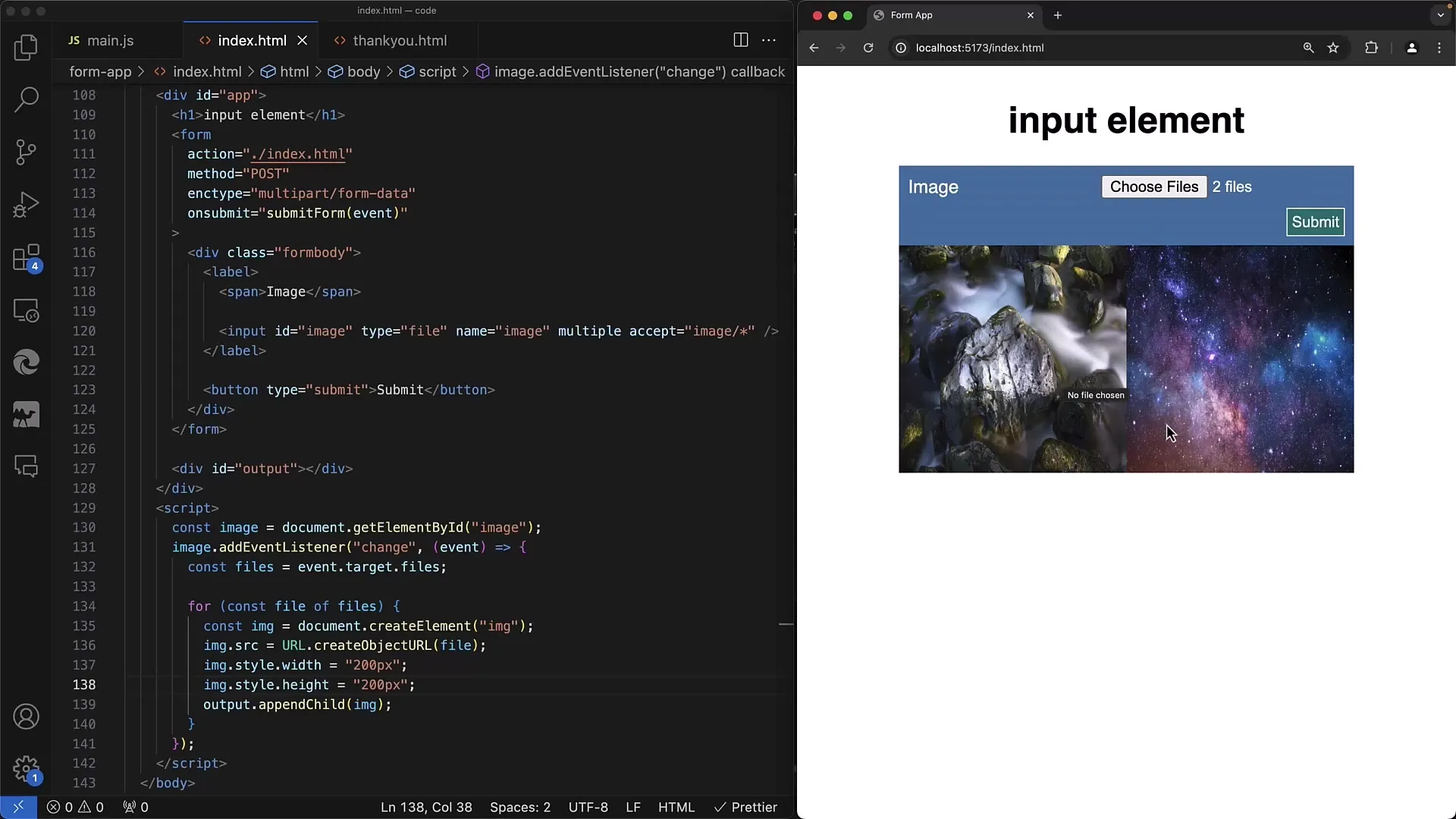 Most van itt az ideje, hogy bejárd és megjelenítsd az összes kiválasztott fájlt. Létrehozhatsz egy elemet, amely megjeleníti a fájl előnézetét, ha az URL.createObjectURL() függvényt használod.