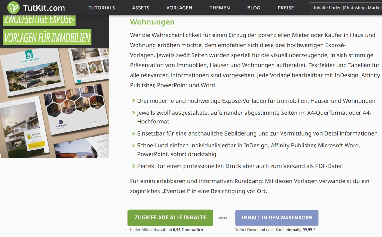 - Exposé 12 halaman: Layak untuk dilihat setiap halamannya – Anda akan mendapatkan banyak halaman contoh untuk presentasi properti menyeluruh (format A4 vertikal, 12 halaman, untuk Affinity Publisher, InDesign, dan Word)