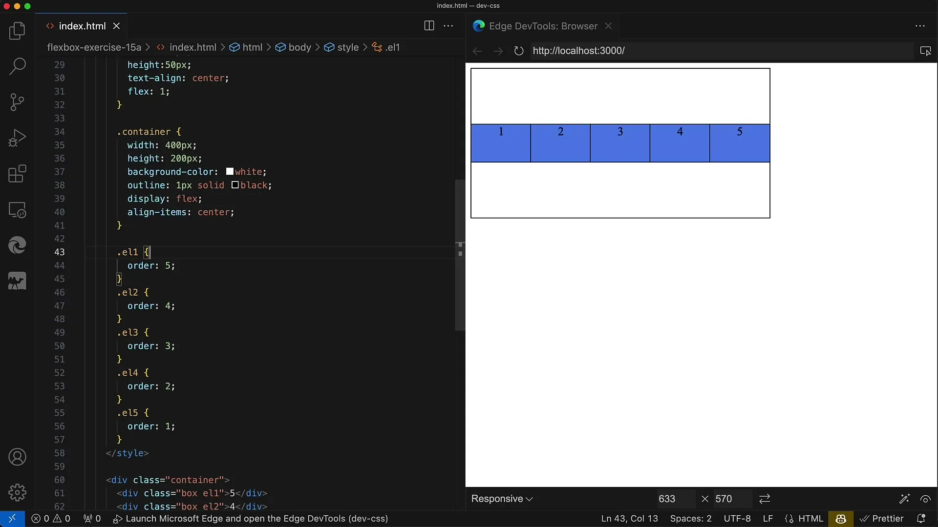 Setelah Anda mengubah flex-direction menjadi row-reverse, simpan lagi file Anda dan lihat pratinjau di browser. Sekarang elemen-elemen seharusnya ditampilkan dalam urutan yang benar dari 1 hingga 5 tanpa perlu menggunakan properti order.