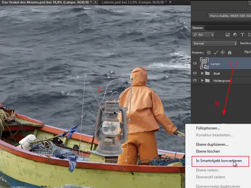 Dengan demikian, kualitas gambar tertinggi dijamin ketika objek kemudian diubah besarnya. Sekarang Anda dapat menyusutkan lentera dan menempatkannya di tempat yang diinginkan (2).