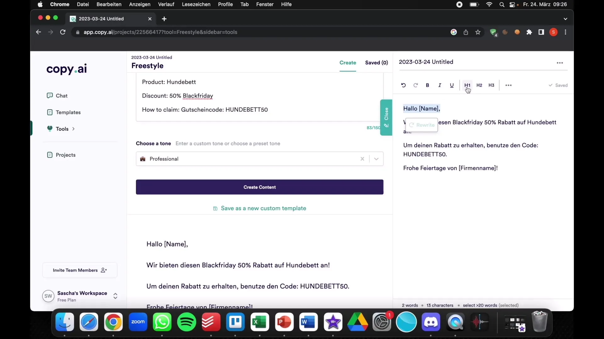 Untuk memulai proyek baru, klik "Proyek Baru" atau "Mulai Proyek". Pilih tujuan proyek yang diinginkan, misalnya "Email Diskon". Anda juga dapat menentukan bahwa Anda ingin membuat proyek dalam bahasa Jerman.