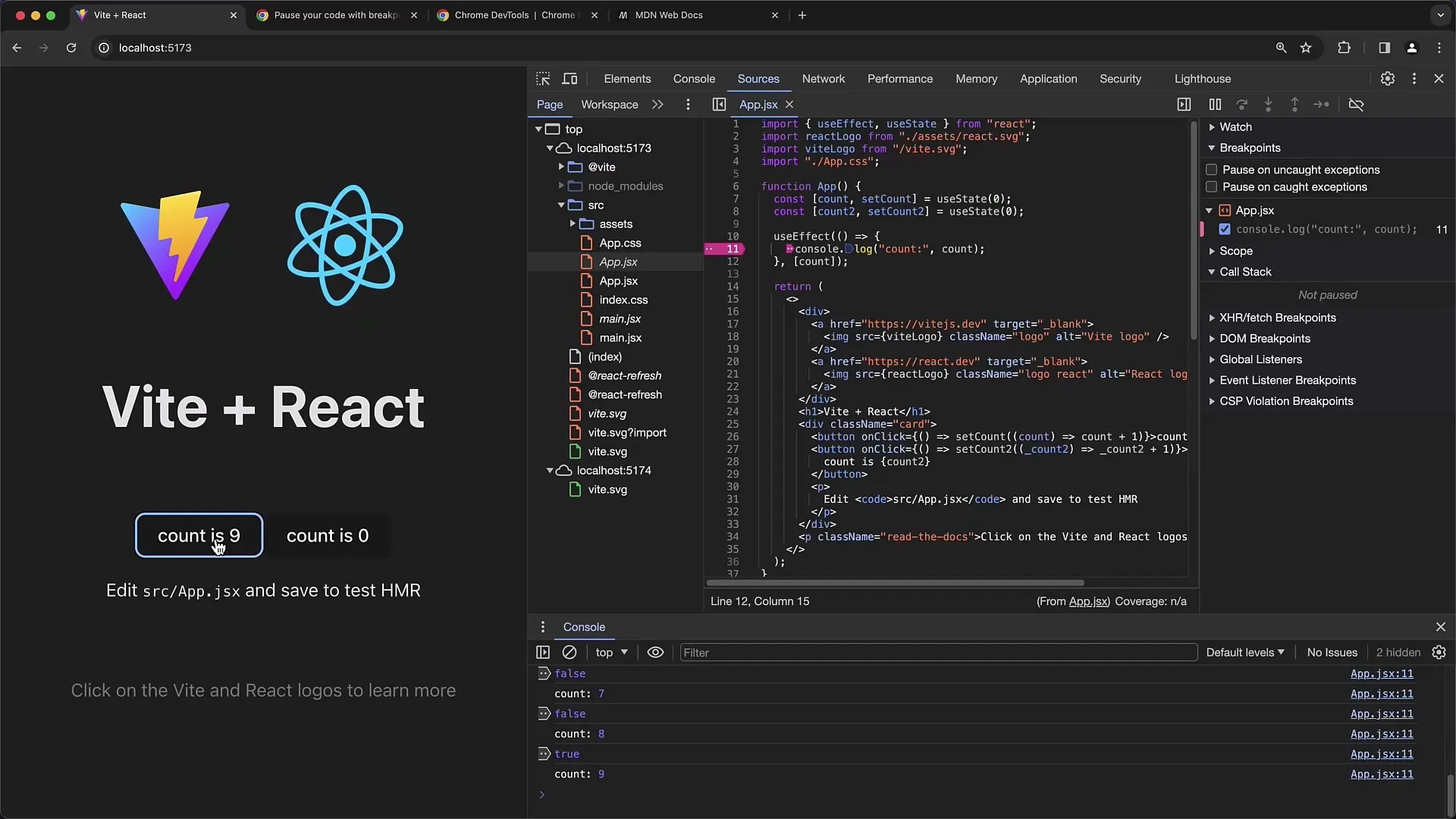 Sekarang muat ulang halaman. Pada titik ini, Debugger seharusnya tidak akan berhenti karena kondisi belum terpenuhi atau belum diperiksa. Tekan count beberapa kali untuk meningkatkannya.
