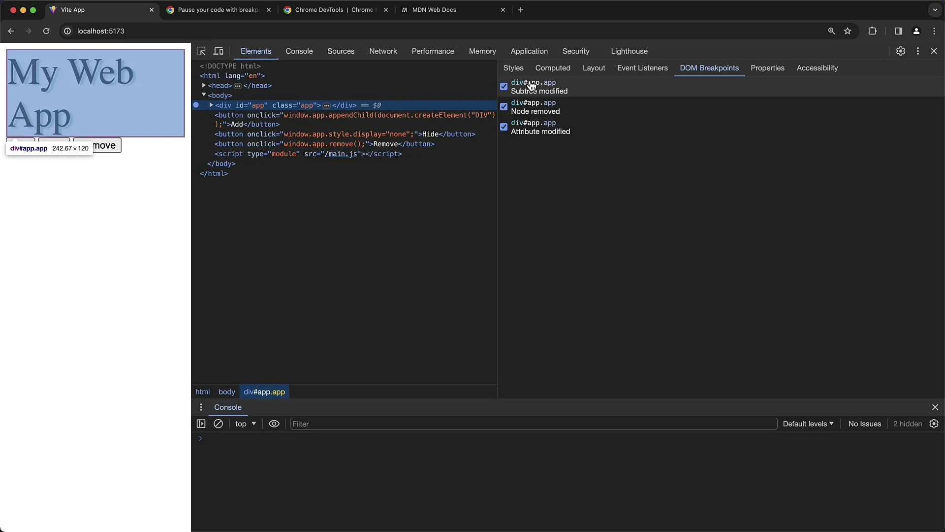 Untuk menetapkan DOM-Breakpoint, pilih elemen yang ingin kamu pantau. Pada contoh kami, kami memilih sebuah elemen div dengan ID "App".