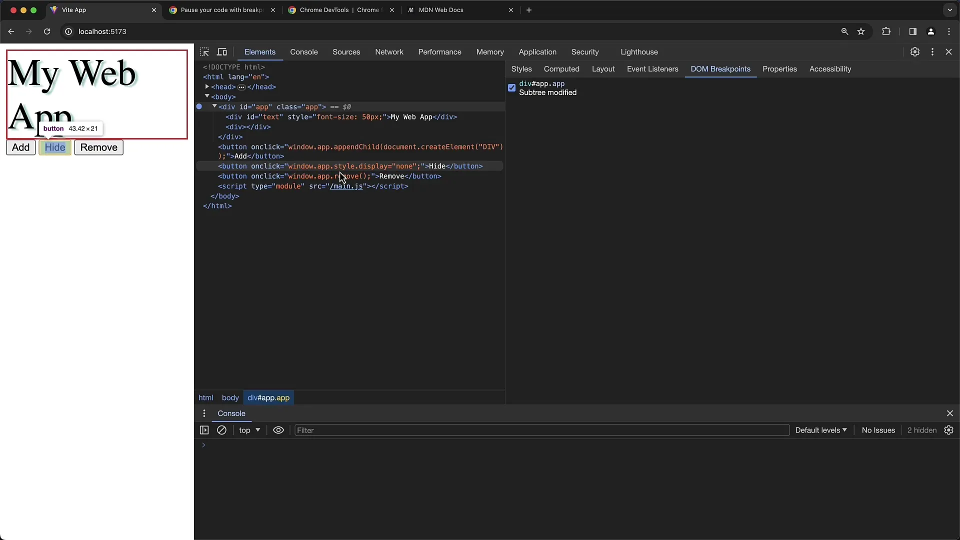Saat kamu mengaktifkan "Subtree Modifications", Breakpoint akan ditempatkan pada setiap perubahan pada elemen anak dari elemen div yang dipilih. Pada contoh kami, kami memiliki sebuah tombol yang menambahkan anak baru ke div kami dengan ID "App".