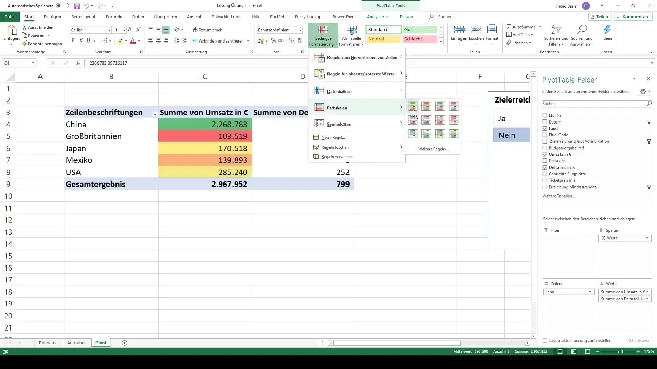 Untuk memvisualisasikan data dengan lebih baik, Anda sekarang ingin membuat grafik. Pilih tabel pivot dan pergi ke "Analisis" kemudian ke "Grafik Pivot". Pilih bentuk diagram yang sesuai, misalnya diagram lingkaran.