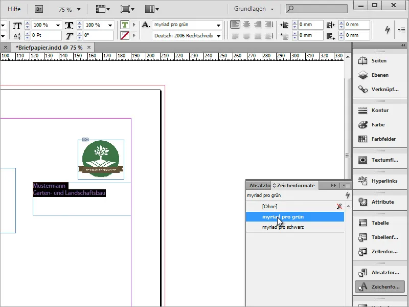 Anda dapat menempelkan teks yang disalin ke dalam area teks ini menggunakan Strg+V. Jika teks belum terpilih, pilih teks terlebih dahulu, lalu berikan Format Karakter. Dalam contoh ini, digunakan variasi hijau dari Myriad Pro.