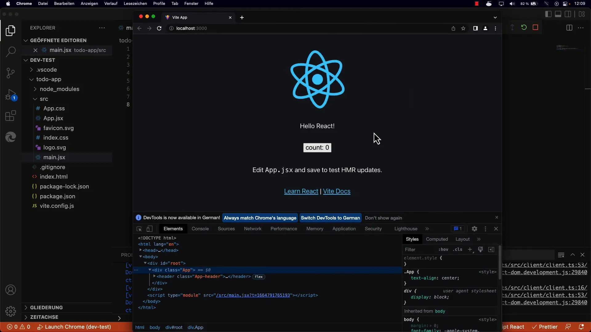 Selanjutnya, Anda harus membuat simpul akar React. Ini dilakukan dengan metode createRoot. Anda akan menyampaikan ini ke elemen DOM yang telah Anda definisikan sebelumnya dalam index.html. Anda akan mengakses div dengan ID root dan memulai simpul akar.