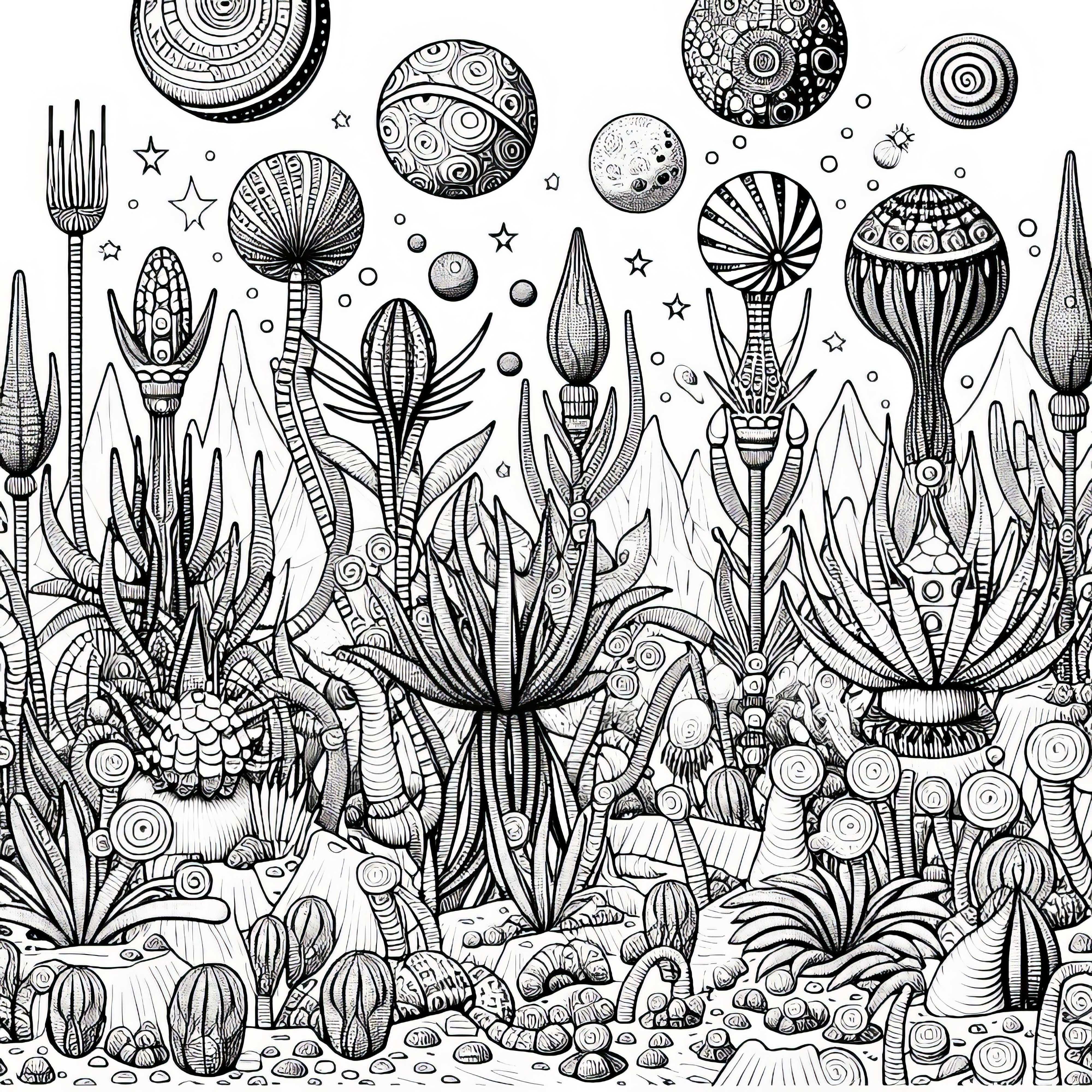 Di gambar mewarnai kami, kamu akan melihat berbagai Tanaman Alien yang merangsang imajinasi. Biasanya, tanaman-tanaman ini diberi warna cerah seperti ungu, hijau neon, atau biru cerah untuk menampilkan sifat ekstraterestrial mereka. Gambar ini dapat kamu unduh gratis dan cetak dalam format JPG. Ini cocok untuk dicetak maupun untuk mewarnai secara online. Ambil gambar mewarnai kamu sekarang dan warnai sesuai seleramu!