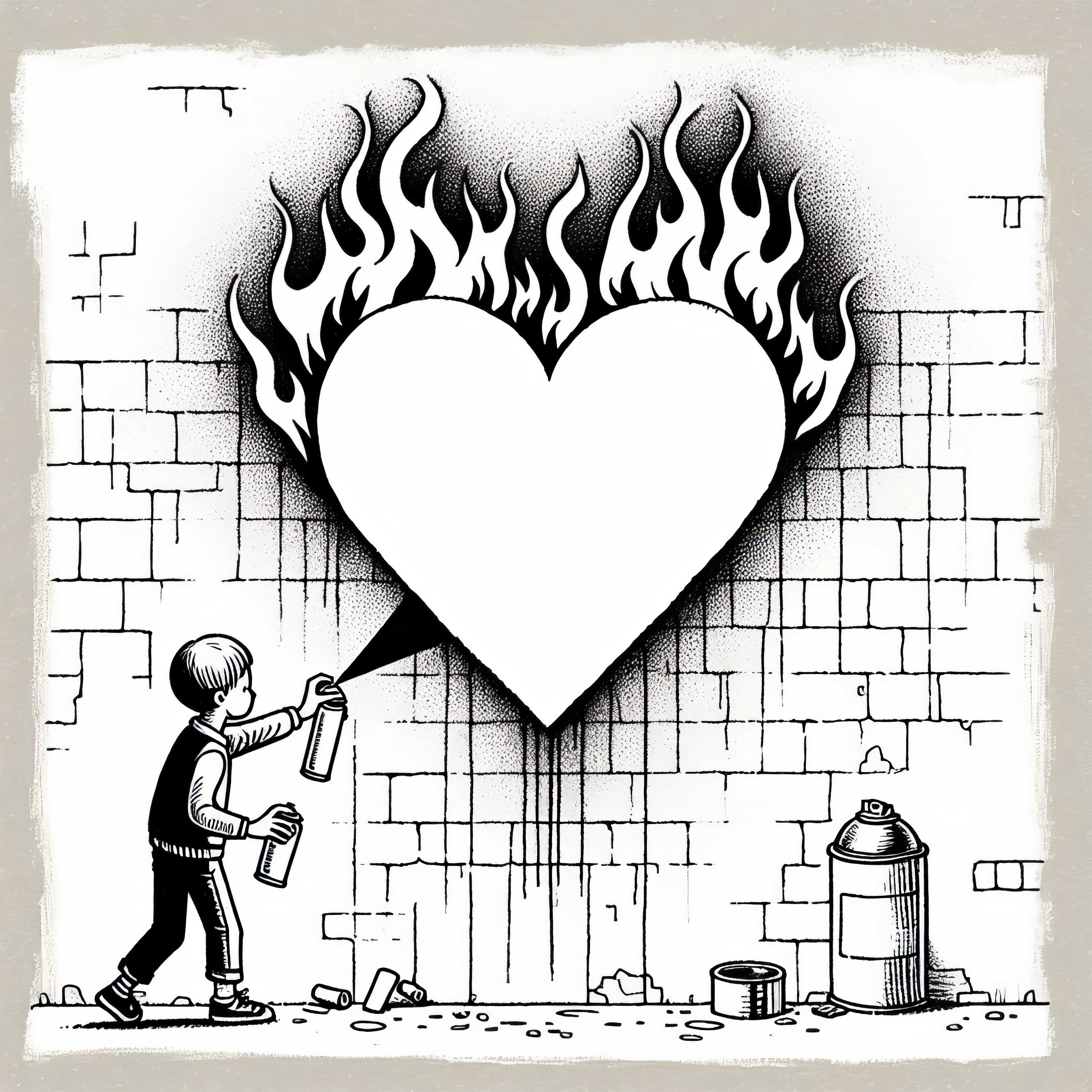 Anak laki-laki menyemprotkan hati besar dengan api ke sebuah dinding - Gambar mewarnai grafiti gratis