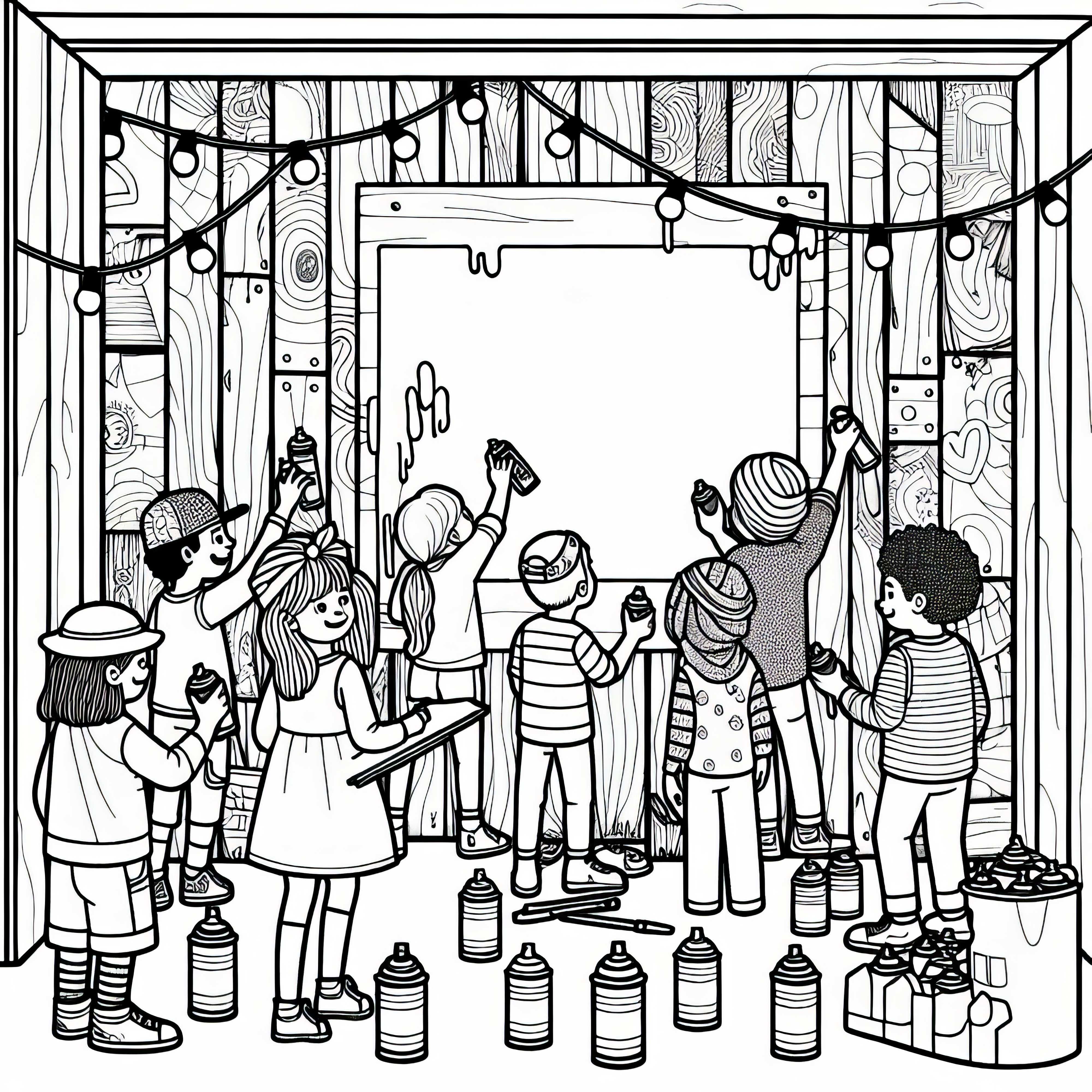 Anak-anak mewarnai dinding kayu dengan cat semprot di sebuah festival jalanan - Gambar mewarnai grafiti gratis