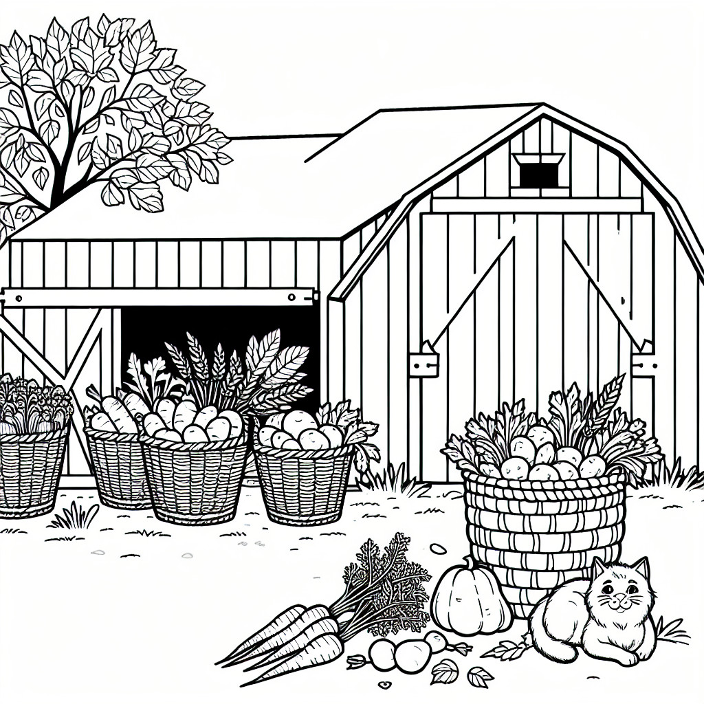 Dalam gambar ini, kamu melihat sebuah gudang yang menawan, didekorasi dengan keranjang hasil panen. Saat mewarnai, kamu bisa bermain dengan warna-warna hangat dan kuat. Bayangkan bagaimana gudang bersinar di pagi hari dengan nuansa kuning dan merah yang lembut, sementara keranjang dipenuhi dengan berbagai buah warna-warni.
