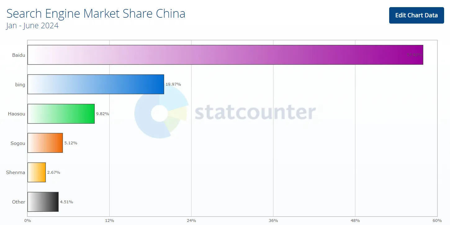 Riguardo a Bing, è importante precisare: Bing funziona effettivamente in Cina, ma deve rispettare rigide leggi sulla censura per mantenere la sua presenza sul mercato cinese. Ciò include la censura dei risultati di ricerca secondo le normative statali. Nonostante queste regolamentazioni, la quota di mercato di Bing probabilmente è inferiore a quanto mostrato nel grafico, poiché i motori di ricerca locali come Baidu continuano a dominare (mia opinione, tratta da altre fonti pubbliche).