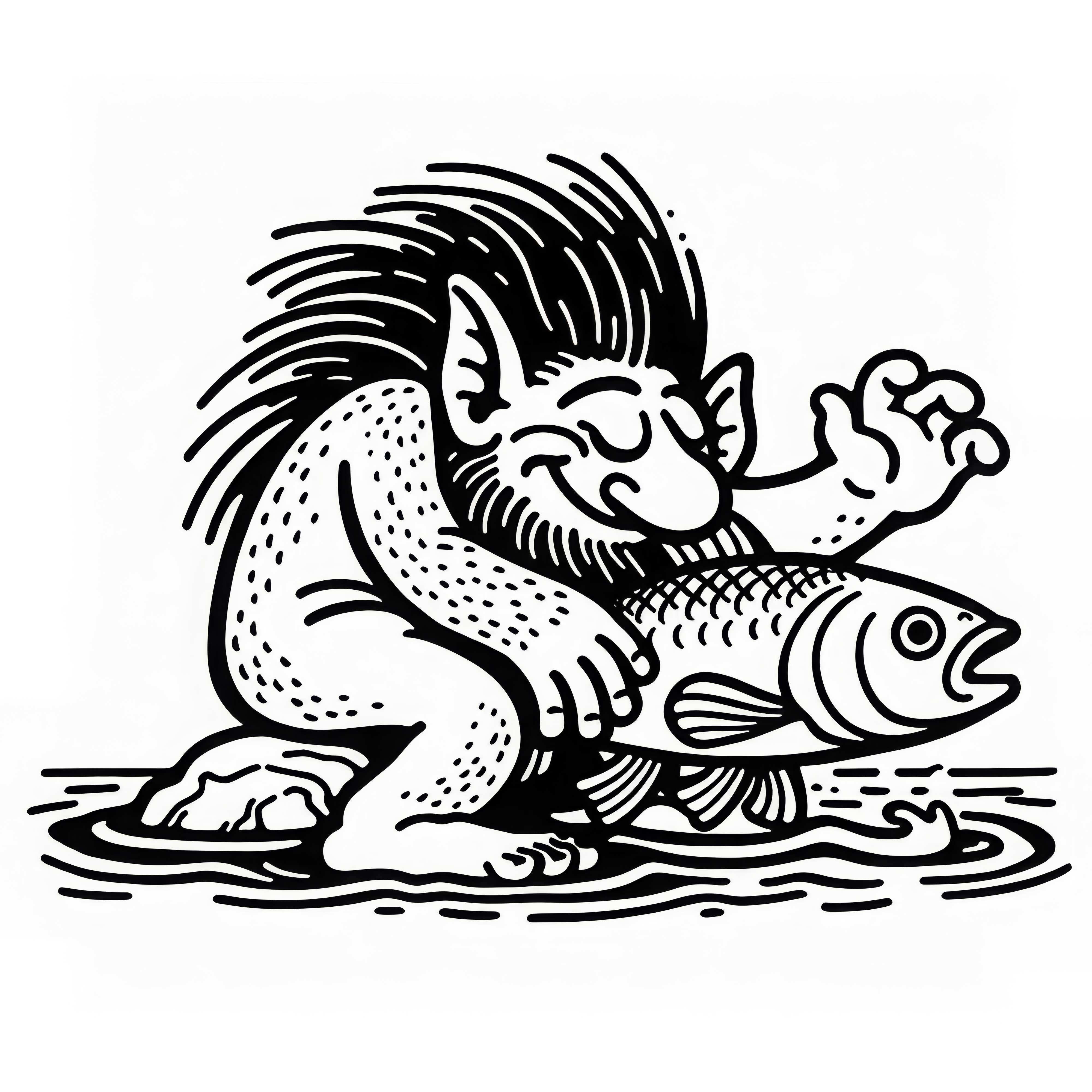 Il troll gioca con un grande pesce: Modello di disegno dettagliato (Gratis)