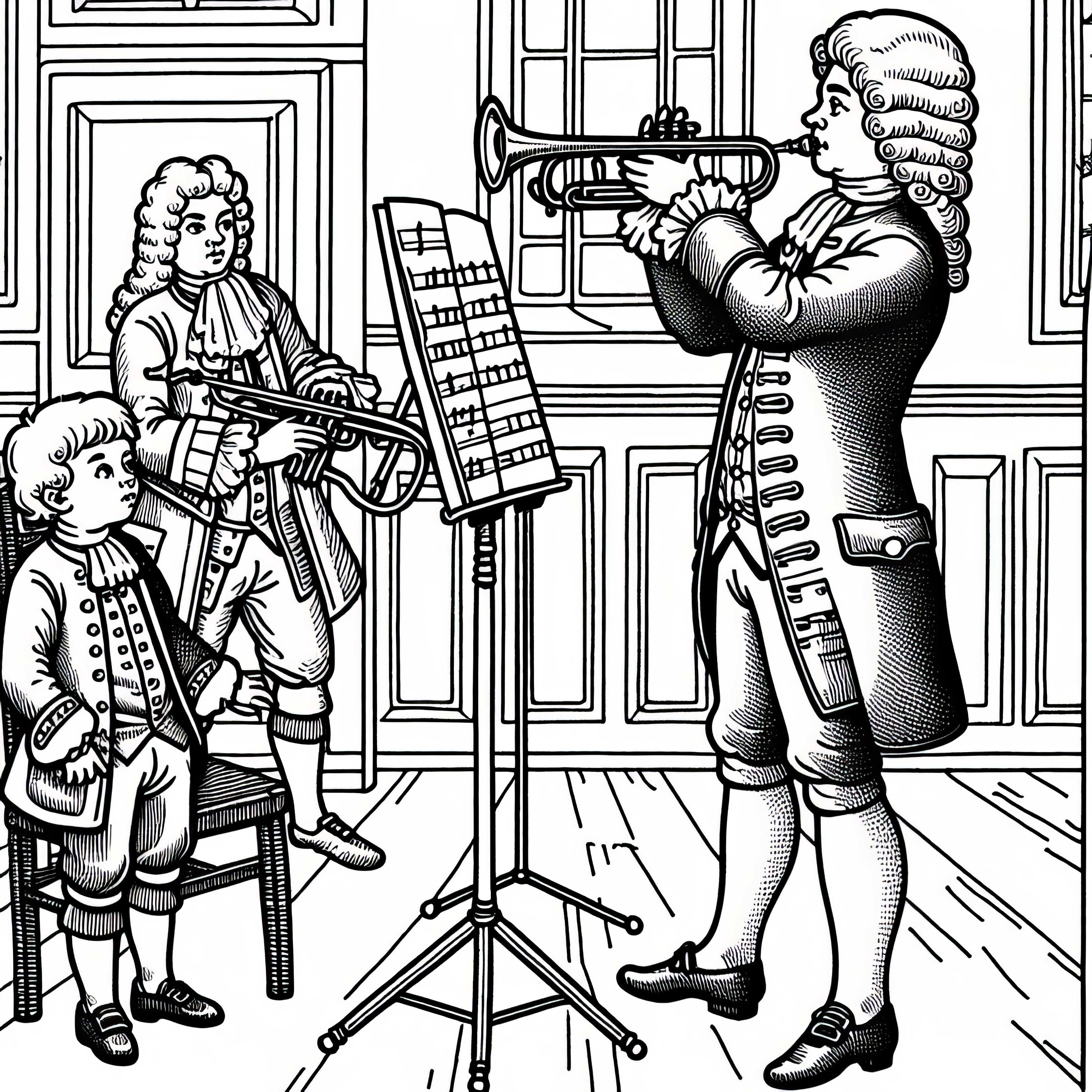 Bambino ascolta il musicista che suona il clavicembalo - Disegno da colorare Periodo Barocco gratuito