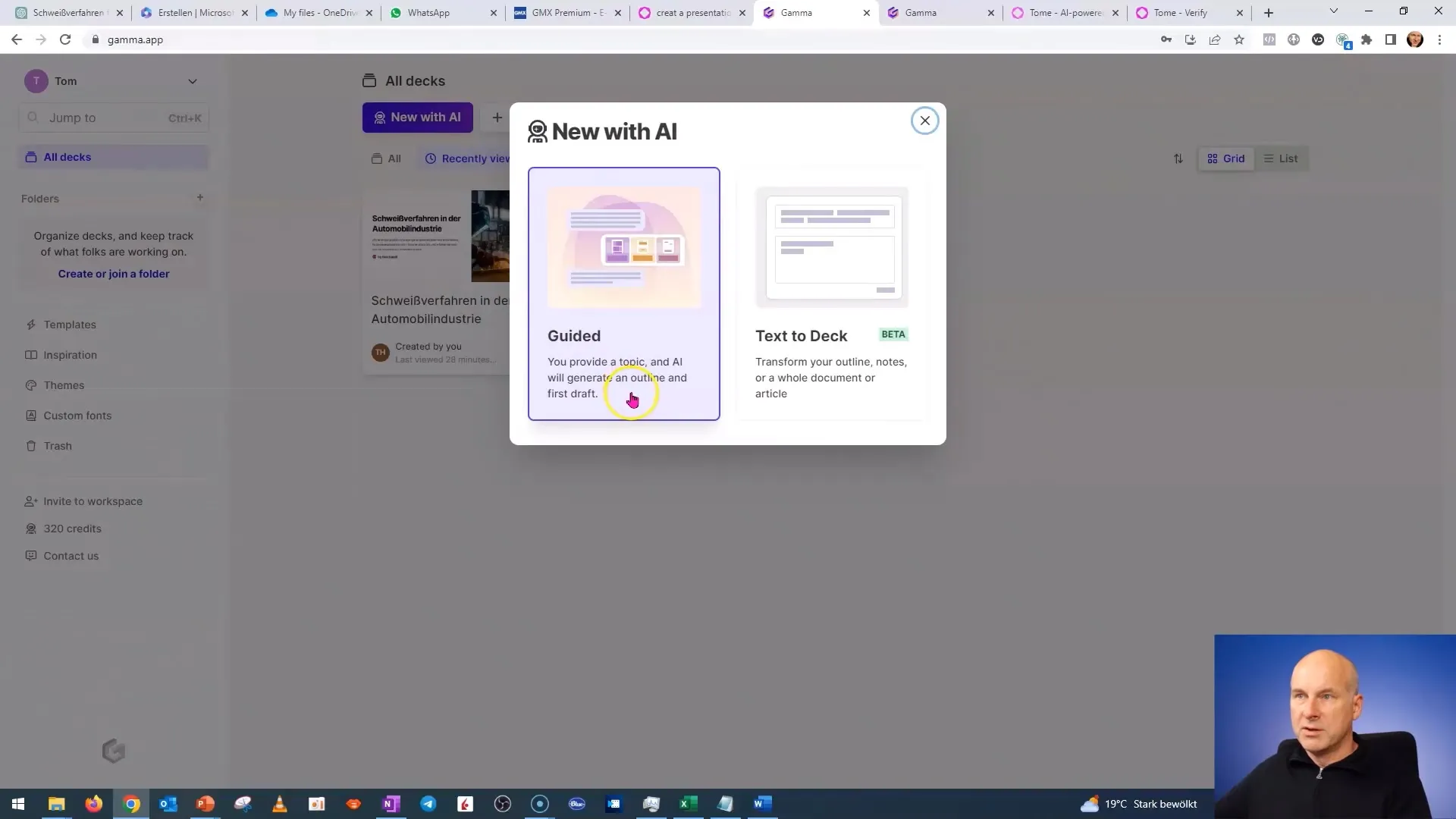 Inizia visitando la piattaforma AI online di tua scelta. In questo esempio utilizziamo l'app Gamma. Dovrai registrarti, di solito gratuitamente. Cerca l'opzione per creare un nuovo progetto e fai clic su di essa.