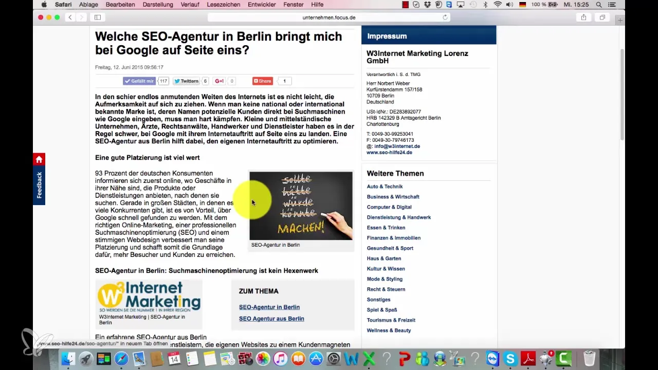 Controlla il tuo posizionamento nei risultati di Google. Se cerchi parole chiave come "agenzia SEO Berlino", puoi vedere che gli articoli di Focus hanno aiutato non solo te, ma anche altri a figurare in cima ai ranking. Questa visibilità è un chiaro indicatore del successo di questa strategia.