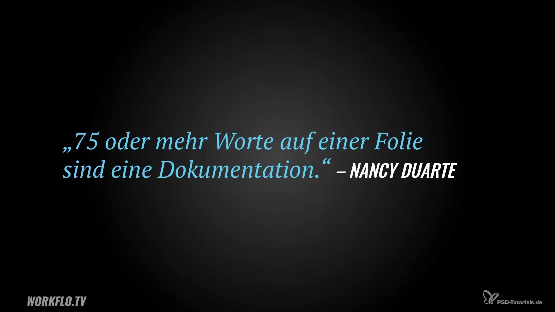 Un punto importante nella progettazione delle tue diapositive è la regola dei 3 secondi. Questa regola afferma che le tue diapositive non devono essere sovraccariche. Entro tre secondi, lo spettatore dovrebbe essere in grado di afferrare e comprendere di cosa si tratta. Fai attenzione a non utilizzare più di 75 parole per diapositiva, per mantenere la presentazione chiara.
