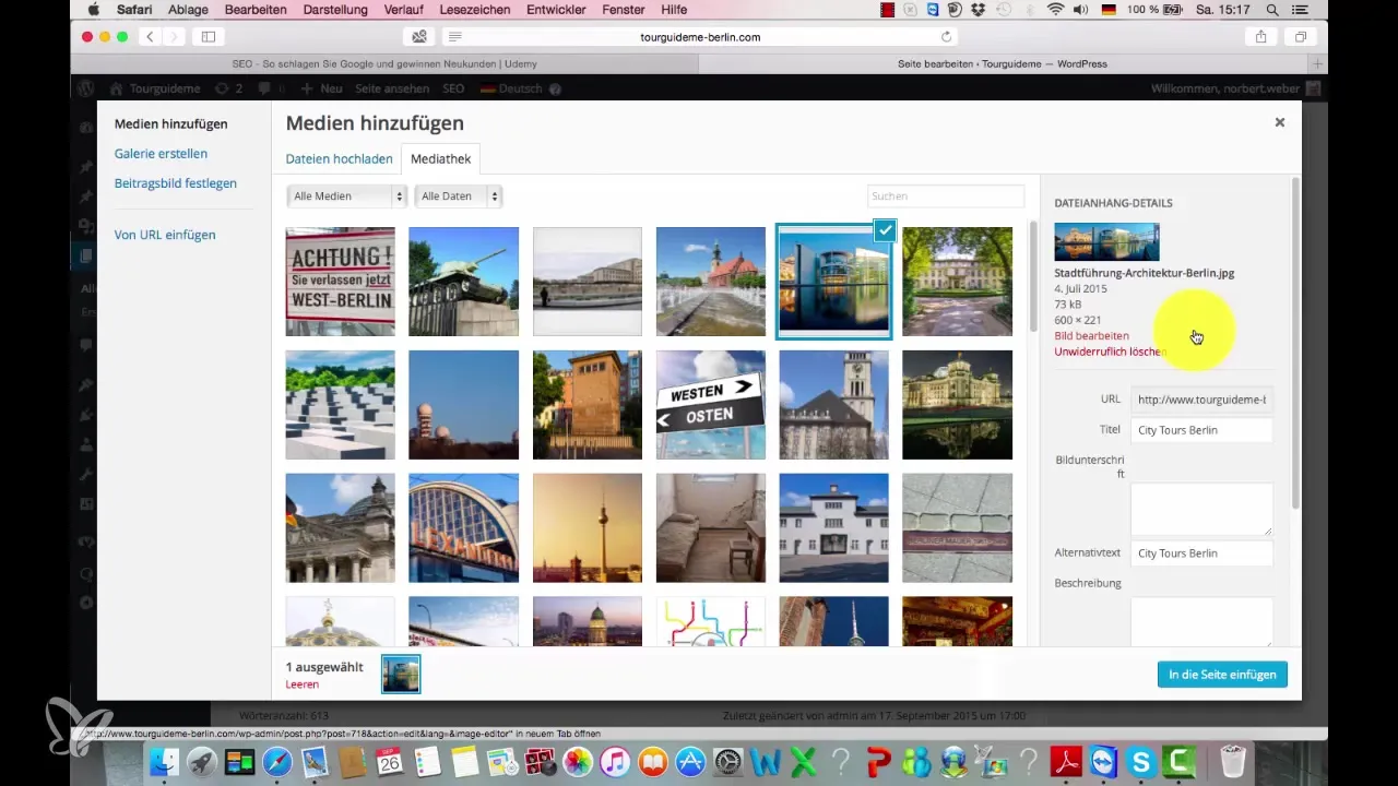 Un esempio interessante: hai un'immagine della Cancelleria federale. Qui dovresti compilare il titolo e il testo alternativo con la tua parola chiave principale. Entrambi dovrebbero contenere la tua parola chiave principale affinché Google possa catturare il contenuto dell'immagine. Vai quindi nel campo di modifica della tua immagine e inserisci le informazioni pertinenti.