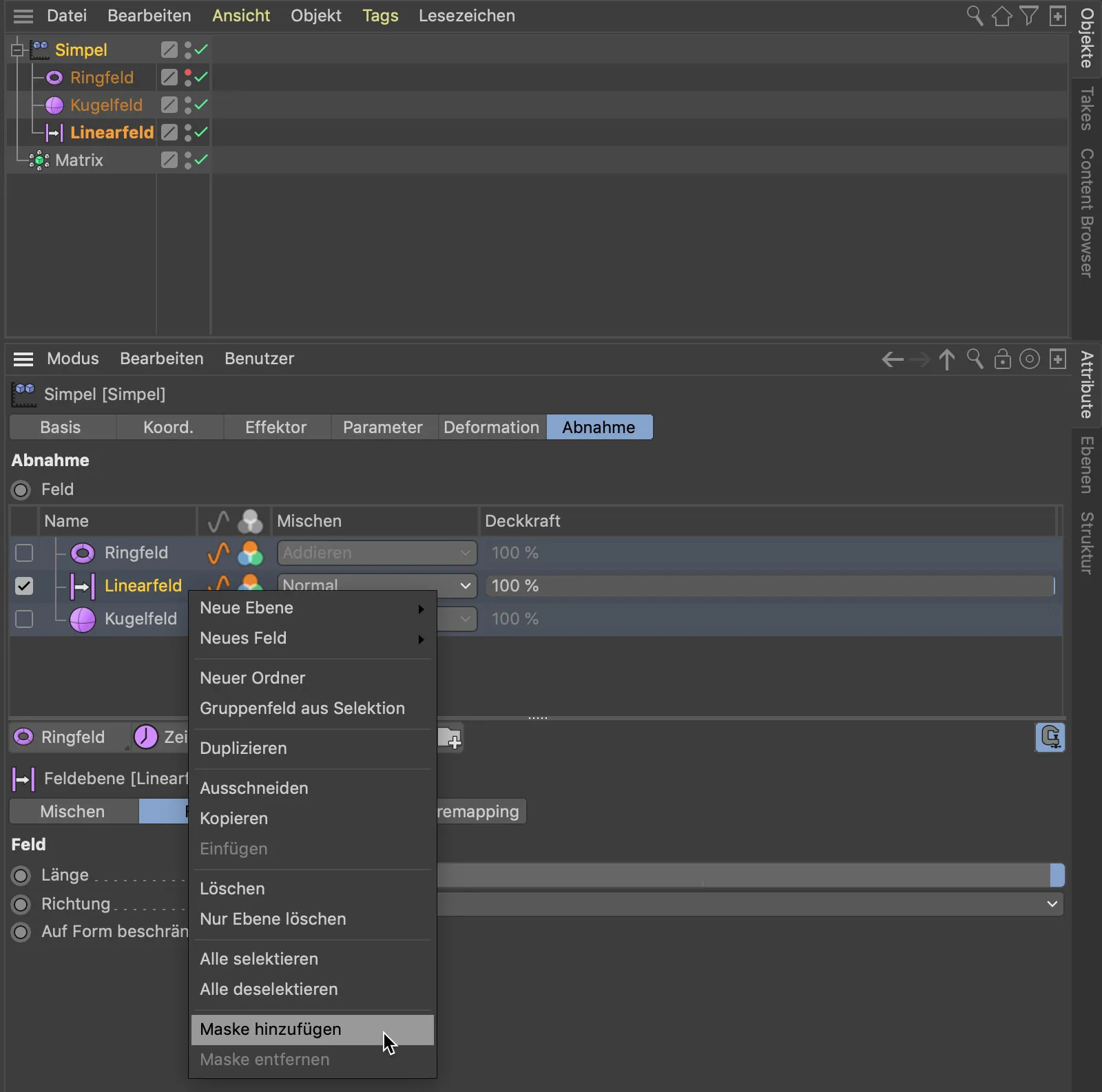 Alternativamente, per creare una maschera per un livello di campo, possiamo utilizzare il pulsante corrispondente sotto la lista dei livelli di campo. La maschera creata è un sottooggetto del livello di campo su cui agisce. Trascinando e rilasciando un altro livello di campo come il campo sferico nella maschera, il campo sferico funge da maschera per il campo lineare.